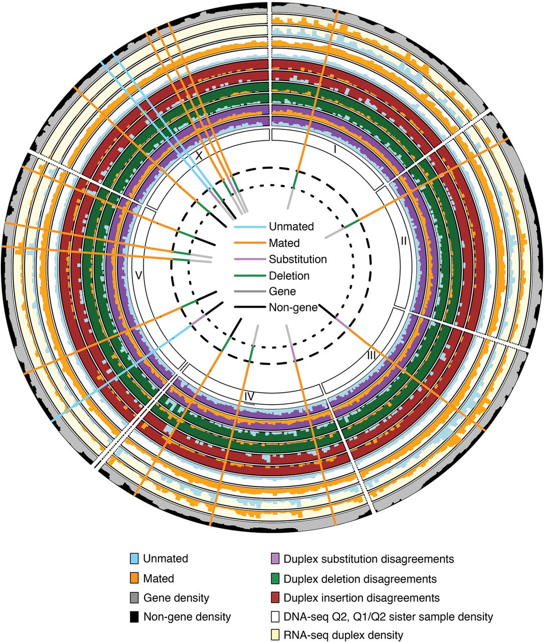 Graphical overview of sequencing results and detected mutations. Densities of DNA-seq Q2 candidates with at least one Q1/Q2 candidate at a matching position in the sister sample, RNA-seq duplex coverage, gene regions, and duplex disagreements are shown on outer tracks. Detected mutations, color-coded by kind, sample type (mated or unmated), and location type (gene or nongene) are shown as bars.