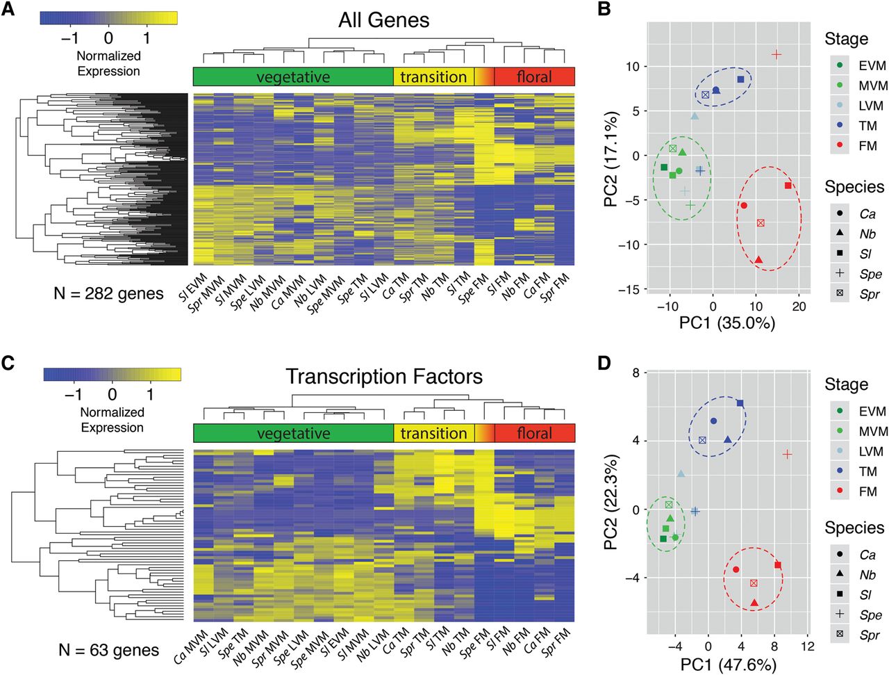 Clustering and principal component analysis (PCA) of dynamically expressed (DE) genes during meristem maturation. RNA-seq was used to quantify gene expression in the EVM, MVM, LVM, TM, and FM stages. (A) EdgeR was used to identify dynamically expressed genes between meristem stages within each species (Methods). Expression was Z-score normalized within species, and hierarchical clustering was visualized by heatmap, with hot colors (yellow) indicating higher expression and cold colors (blue) lower expression. Clustering generally grouped vegetative, transition, and floral meristem stages together, with the exception of the Spe TM and FM, which associated with vegetative and transition clusters, respectively, reflecting the severe delay in meristem maturation compared to Sl (Park et al. 2012). (B) PCA of normalized expression from DE genes. The first two PCs account for ∼52% of the overall variation, with PC1 primarily accounting for differences between vegetative and floral meristem stages. PC2 primarily separates the transition stage from vegetative and floral. Regions where the majority of vegetative, transition, and floral samples cluster together are indicated by green, blue, and red dashed ovals, respectively. Three notable outliers from the main vegetative, transition, and floral groups include the Spe TM and FM, and the Nb LVM, reflecting heterochronic shifts in expression that imply a delay (Spe) and acceleration (Nb) in meristem maturation. Heatmaps (C) and PCA (D) based on 63 DE transcription factors also reflect heterochronic shifts in expression and maturation schedules.