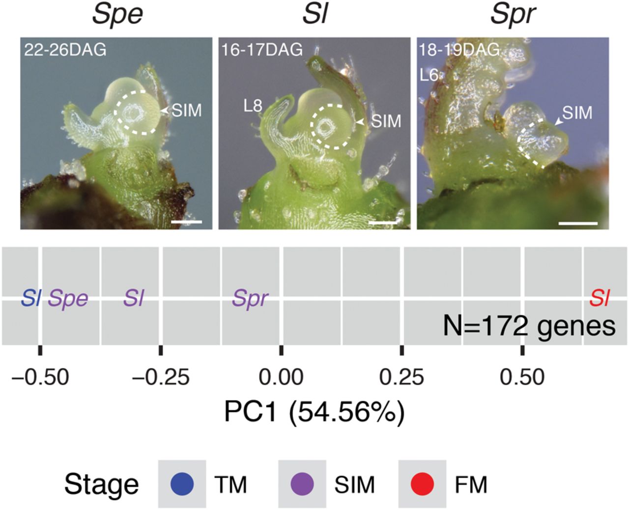 PCA of sympodial inflorescence meristem (SIM) transcriptomes from multiflowered species. The maturation state of each SIM was assessed by PCA of normalized gene expression. The tomato TM and FM were included as reference stages. The analysis was restricted to TM and FM marker genes (twofold higher expression in the TM or FM than any other stage) (Methods). PC1 accounted for 55% of the variation, with the tomato TM and FM representing the minimum and maximum values, respectively. As expected, all SIMs were intermediate between the tomato TM and FM. Notably, PC1 was positively correlated with inflorescence complexity with the Spe SIM closest to the tomato TM, Sl SIM intermediate, and Spr SIM closest to the tomato FM, indicating PC1 predicts SIM maturation state and flower production potential in multiflowered species. White scale bars represent 100 µm. Reference images of SIM for S. lycopersicum and S. peruvianum adapted from Park et al. (2012).