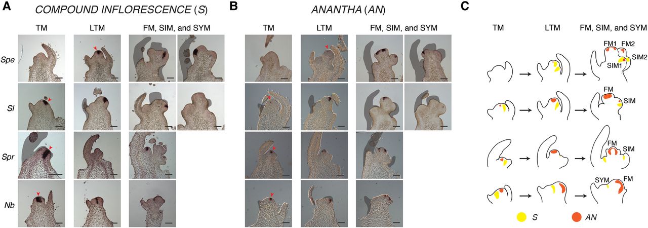 Four species comparative mRNA in situ hybridization of the inflorescence architecture genes COMPOUND INFLORESCENCE (S) and ANANTHA (AN). Scaled expression values for S and AN are shown in Figure 3, G and H. (A) S is expressed in the tomato TM, late TM (LTM), and SIM, and shows delayed expression in the Spe LTM. Conversely, Spr and Nb have strong expression of S in the TM, with Spr also expressing S in the sympodial shoot meristem (SYM). Earliest expression of S is indicated by a red arrowhead. (B) AN is expressed weakly in the tomato TM and increases in the LTM, reaching peak expression in the FM. Expression in Spe only begins in the LTM and FM/SIM. In contrast, AN is expressed strongly in the TM stages of Spr and Nb. The earliest detected expression is indicated by a red arrowhead. (C) Cartoons of meristem maturation stages depicting expression dynamics and patterns of S and AN across the four species. Black scale bars represent 100 µm.
