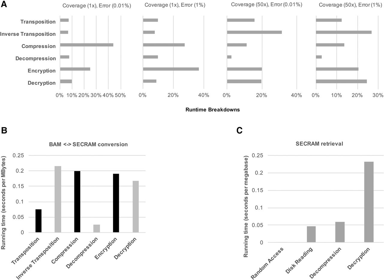 Runtime analysis of SECRAM system for storing and retrieving genomic data. (A) Runtime breakdowns on simulated data sets for the six most important procedures in SECRAM: transposition, inverse transposition, compression, decompression, encryption, and decryption, relative to total runtime (=100%). The experiments were repeated for four simulated data sets with low (1×)/high (50×) coverages and low (0.01%)/high (1%) error rates. In all cases, the runtime cost of encryption/decryption is comparable with other necessary procedures, showing that enforcing security does not result in significant performance overhead. (B) Conversion time on real data sets (same data sets as those in Fig. 2B). It shows the average conversion time between the BAM and SECRAM formats on real data sets, running with a single thread on a machine equipped with Mac OS X Yosemite system and 3.1-GHz Intel Core i7 processor. The black bars (transposition, compression, encryption) represent the three steps of conversion from BAM to SECRAM, whereas the light gray bars (decryption, decompression, inverse transposition) represent the three steps of conversion from SECRAM to BAM. Each step takes <0.25 sec per megabyte of data. (C) Retrieval time on real data sets (same data sets as those in Fig. 2B). It shows the average runtime cost of retrieving data within a range of 1 million genomic positions. The actual data size corresponding to 1 million positions depends on the coverage. Shown are experiments on real data sets from Figure 2B with a coverage of about 3× and a size of slightly >1 megabyte.