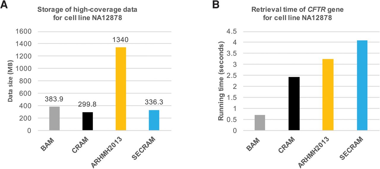 (A) Storage and (B) runtime on high-coverage clinical data. The data come from a public cell line (NA12878), based on a gene panel that includes the CFTR gene, queried for diagnosing cystic fibrosis. The average coverage of these data is 1035×, containing more than 4 million reads of length around 300 bases. ARHMH2013 (Ayday et al. 2013) is a privacy-preserving solution on BAM files that does not address the compression requirement. We observe a consistent compression performance of SECRAM on high-coverage clinical sequence data. Moreover, querying for the CFTR gene on SECRAM takes less than twice the time on the nonencrypted CRAM.