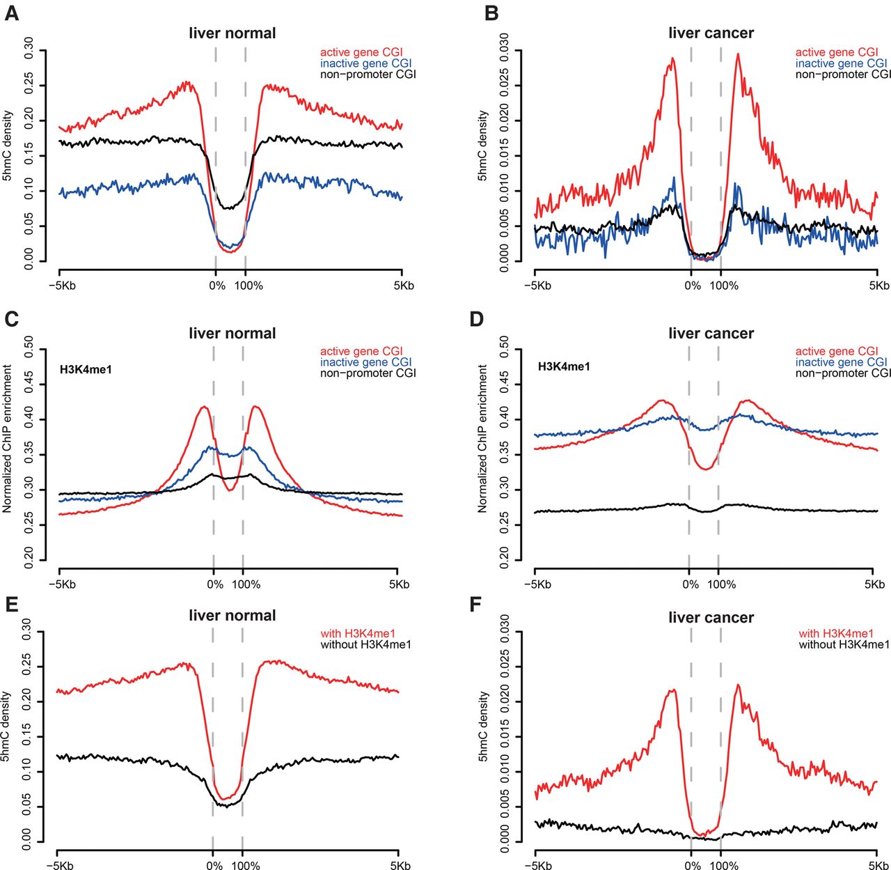 5hmC showed a bimodal distribution around CGIs and associated with H3K4me1. (A,B) 5hmC distribution around different CGI categories in liver normal (A) and liver tumor (B). (C,D) H3K4me1 enrichment around different CGI categories in liver normal (C) and liver tumor (D). (E,F) H3K4me1 associated with 5hmC enrichment in CGI shores in liver normal (E) and liver tumor (F).