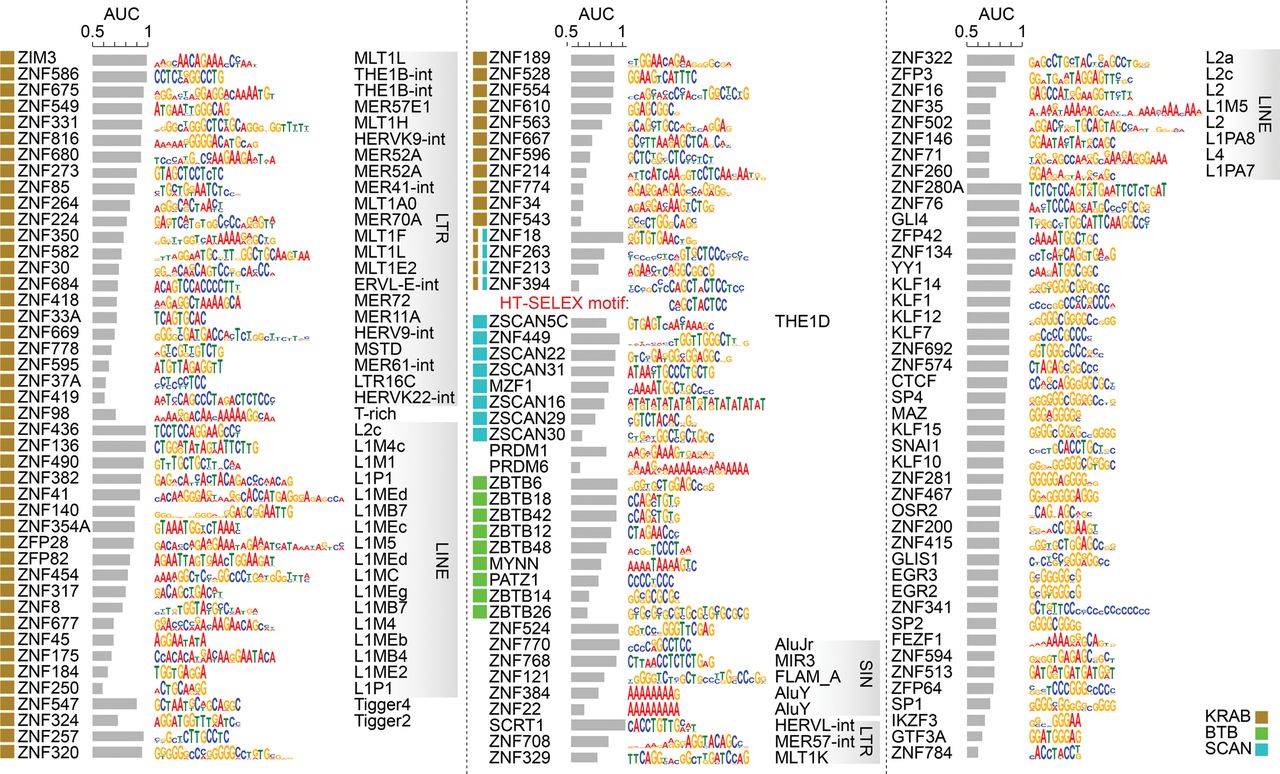 Motifs for the 131 C2H2-ZF proteins analyzed by ChIP-seq. Motifs are identified using either MEME or RCADE (see Supplemental Methods). The area under the ROC curve (AUC) of each motif for distinguishing top 500 peaks from dinucleotide-shuffled sequences is shown, along with the log odds sequence logo of the motif. For proteins whose motif-containing peaks overlap significantly with repeat elements at FDR <0.01, the repeat type with the most significant enrichment (i.e., the smallest P-value) is shown on the right. The squares on the left of the proteins represent effector domains. For ZNF394 both the ChIP-seq motif (top) and the HT-SELEX motif (bottom) are shown. See also Supplemental Figure S2, Supplemental Tables S2 and S3.