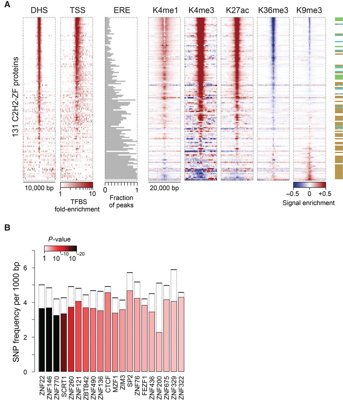 Genomic distribution of C2H2-ZF binding sites. (A) Enrichment of binding sites around different genomic features as well as histone marks. For DHS and TSS, the color map represents fold-enrichment of binding sites around these genomic features relative to distribution of binding sites around random genomic points. For histone marks, the color map shows base-10 logarithm of fold-change of histone mark signal around binding sites, relative to the genomic average of the signal. For EREs, the fraction of peaks that overlap any ERE instance on the genome is shown. (B) Distribution of common SNPs inside C2H2-ZF binding sites, compared to immediate ±20 bp flanking regions. The filled bars represent the frequency of common SNPs within motif hits in the peak regions, whereas dashed bars correspond to the SNP frequency in the ±20 bp region surrounding the motif hits. P-values (based on Binomial test) are shown using the color gradient. Only the proteins with significant SNP depletion at binding sites (FDR<0.025) are shown.