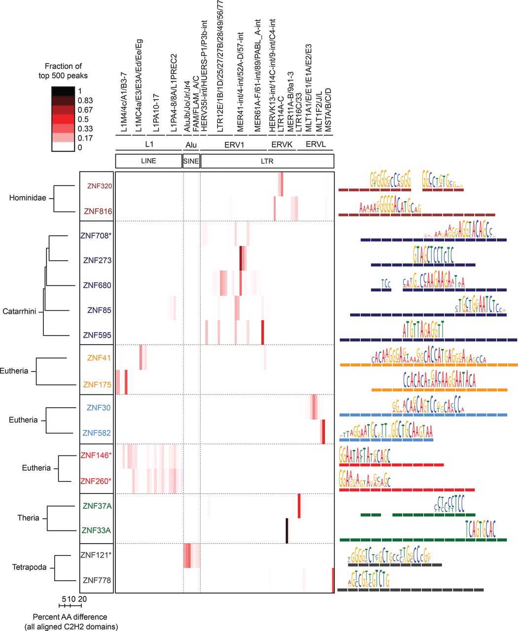 ERE binding pattern in seven groups of C2H2-ZF paralogs. The heat map (center) indicates the fraction of the top 500 ChIP-seq peaks overlapping each ERE (ERE classes indicated at top). Paralogs are grouped together in boxes (left) and their aligned C2H2-ZF domain structures are represented by colored rectangles (right) (Clustal Omega [v.1.2]) (Sievers et al. 2011). Asterisks indicate C2H2-ZF proteins that lack a KRAB domain. Taxon names at left indicate the most recent lineage where the paralogs share at least one homologous finger. Binding motifs (right) are positioned over the corresponding C2H2-ZF domains that recognize each triplet according to RCADE (Najafabadi et al. 2015a). Aligned C2H2-ZF domains of paralogs are displayed as dashed lines in the same color.