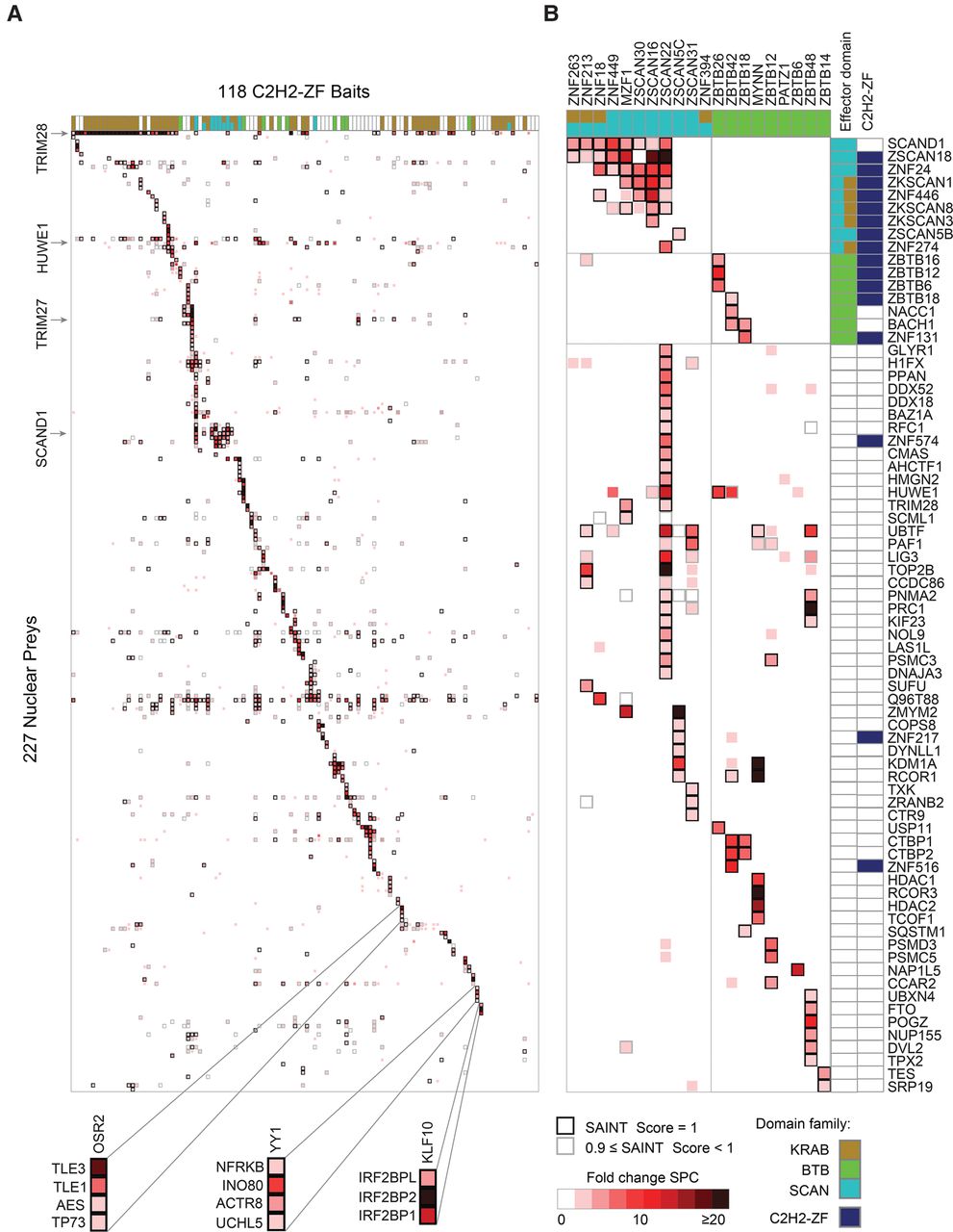 Nuclear protein interactions with C2H2-ZF proteins. AP-MS results for 118 DNA-binding C2H2-ZF proteins. (A) Heat map of PPIs between 118 C2H2-ZF baits and 227 nuclear prey proteins. The fill color represents the fold change spectral counts while the frame color indicates the SAINT score. Colors on top of the heat map represent the effector domain type of the bait proteins. Supplemental Figure S3 contains a version of the heat map with both axes fully labeled. (B) Detailed interactions of all SCAN- and BTB-containing bait proteins. Prey proteins are sorted by their domain type. Colors on top and at the right hand side of the heat map represent the domain types of bait and prey proteins. See also Supplemental Figures S3–S5, Supplemental Tables S5–S9.