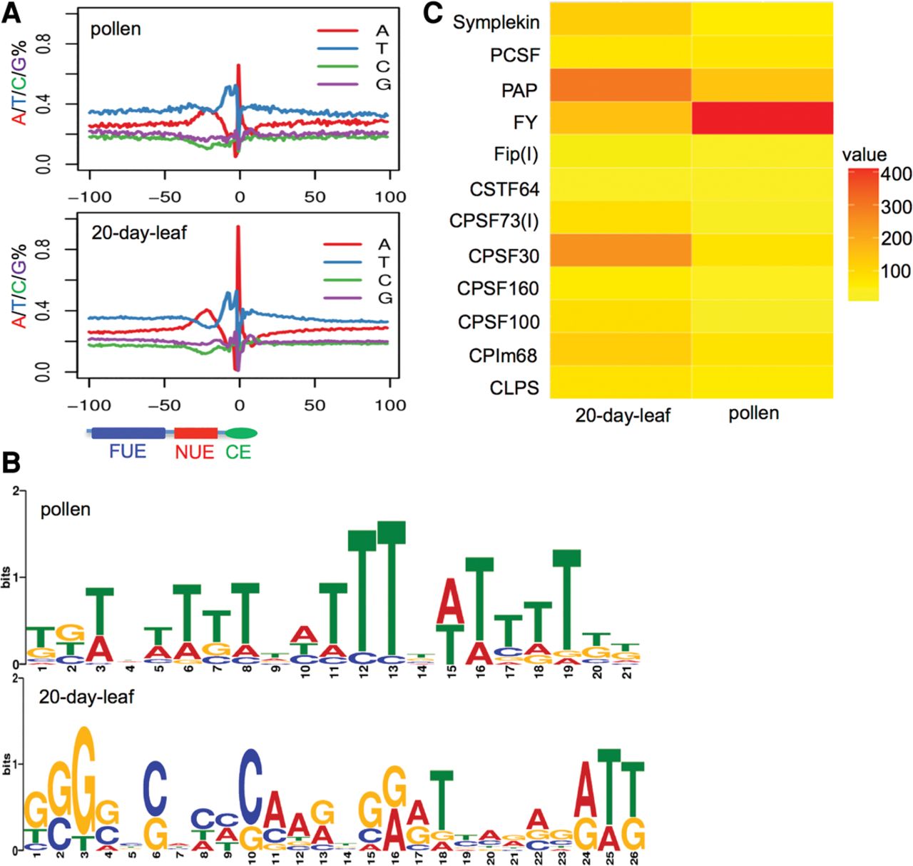 Motif around the poly(A) sites. (A) Single-nucleotide profiles around the poly(A) sites found in different genic regions. (NUE) Near upstream element; (CE) cleavage element; (FUE) far upstream element. (B) Motif analysis by MEME. (Top) Introns of the pollen; (bottom) leaf_20days. Letter heights indicate the frequency. (C) Relative expression levels of poly(A) factors (Hunt et al. 2008) between pollen and leaf_20days. PAP (LOC_Os06g21470), FY (LOC_Os01g72220), Symplekin (LOC_Os07g49320), PCSF (LOC_Os09g3927), Fip(I) (LOC_Os03g19570), CSTF64 (LOC_Os05g43780), CPSF73(I) (LOC_Os03g63590), CPSF30 (LOC_Os06g46400), CPSF160 (LOC_Os04g18010), CPSF100 (LOC_Os09g39590), CFIm68 (LOC_Os07g08960), and CLPS (LOC_Os02g12570). Color blocks indicate total PAT counts for each poly(A).