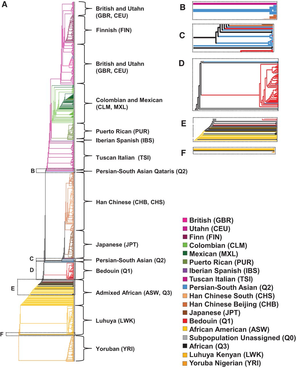 Neighbor-joining tree hierarchical clustering analysis of the combined Qatari genomes and the 1000 Genomes Project Phase 1 samples based on pairwise proportion of shared alleles calculated across the entire autosome. (A) The entire neighbor-joining tree with each of the branches leading to individuals in the 1000 Genomes samples color-coded by continent (Europeans in shades of purple: CEU, FIN, GBR, IBS, TSI; Asians in shades of brown: CHB, CHS, JPT; Africans in shades of orange: LWK, YRI, ASW; Americans in shades of green: CLM, MXL, PUR) and with the Q1 (Bedouin) in red, Q2 (Persian-South Asian) in azure, Q3 (African) in black, and Q0 (Subpopulation Unassigned) in gray. (B) Detail of the three (15%) Q2 (Persian-South Asian) that cluster with Europeans. (C) Detail of the 11 (55%) Q2 (Persian-South Asian) individuals, with three (5%) Q1 (Bedouin), one (5%) Q3 (African), and one (13%) Q0 (Subpopulation Unassigned) that cluster as an outgroup to Asians. (D) Detail of the 50 (89%) Q1 individuals, with three (15%) Q2 (Persian-South Asian), one (5%) Q3 (African), and two (25%) Q0 (Subpopulation Unassigned), that cluster outside the Africans and African Ancestry in Southwest US and that also cluster as an outgroup to all other non-African populations, indicating that they are the most distant ancestors of all non-Africans. (E) Detail showing the three (15%) Q1 (Bedouin), three (15%) Q2 (Persian-South Asian), 12 (60%) Q3 (African), and four (50%) Q0 (Subpopulation Unassigned) that do not form large clusters but are all located within the admixed cluster. (F) Detail of the one (5%) Q3 (African) that clusters between Yoruba (YRI) and Luhya (LWK).