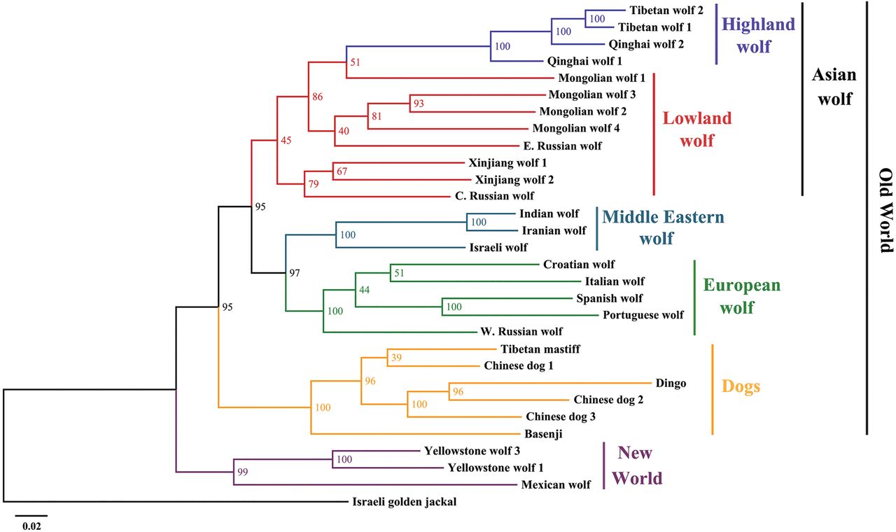 The maximum likelihood tree of 30 sequences. Numbers represent node support inferred from 100 bootstrap repetitions. The reference genome boxer was not included. The Israeli golden jackal is the outgroup.