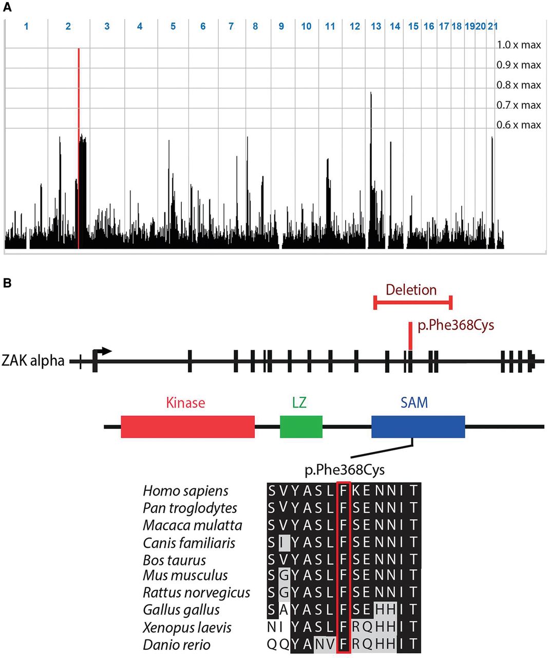 Identification of homozygous ZAK mutations in SFMMP. (A) Representation of genome-wide homozygosity in family F1 following SNP array genotyping with 250k arrays. Homozygosity scores with respect to the maximum LOD score of 3.5 are plotted against the physical position genome-wide. The linkage region on Chromosome 2 is indicated by the red peak; it is 9.1 Mb in size and delimited by recombinant markers rs836624 and rs6433931. (B) Schematic representation of ZAK with the missense mutation and the intragenic deletion shown in red. The ZAK protein contains a kinase domain, as well as a leucine zipper (LZ) and a sterile alpha motif (SAM) domain. Multiple protein sequence alignment; the Phe368Cys mutation site is boxed in red.