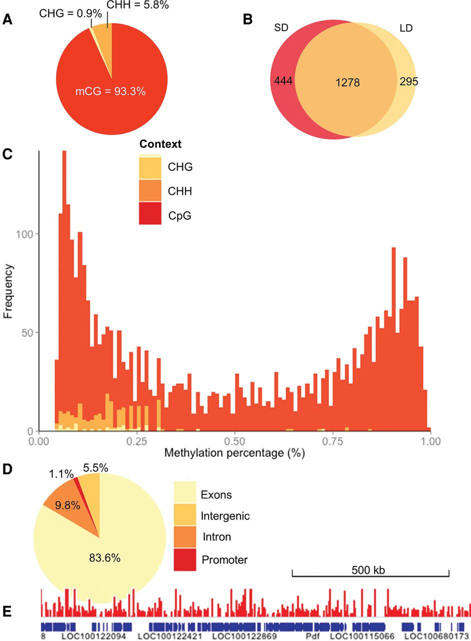 The Nasonia methylome. (A) Distribution of mCs identified in different sequence contexts (mCG, mCHG, and mCHH, where H = non-G). (B) Venn diagram showing that a substantial proportion of the mCGs are methylated under both long- and short-day conditions in contrast to other sequence contexts that show negligible overlap (see text), suggesting that non-CpG methylation represents largely experimental noise. (C) The methylation level of CpG sites (percentage of covering reads that are methylated) shows a bimodal distribution. This bimodality is not seen in CHG or CHH (shaded yellow and orange) methylation contexts. (D) Fraction of mCGs identified in exon, intron, promoters (2-kb upstream of genes), and intergenic regions. (E) A snapshot of the methylome (751-kb region) is depicted overlaid with the raw long-day methylation data (scaled to 0%–2% methylation).