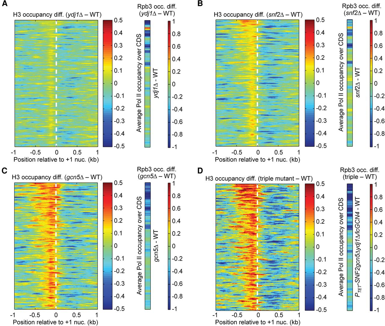 Reductions in Pol II occupancy are associated with increased H3 promoter occupancy for 1000 genes with the greatest eviction of promoter nucleosomes in WT induced cells. (A–D) Heat maps for the identically ordered 1000 genes shown in Figure 2D, constructed as described there, for the indicated mutants.