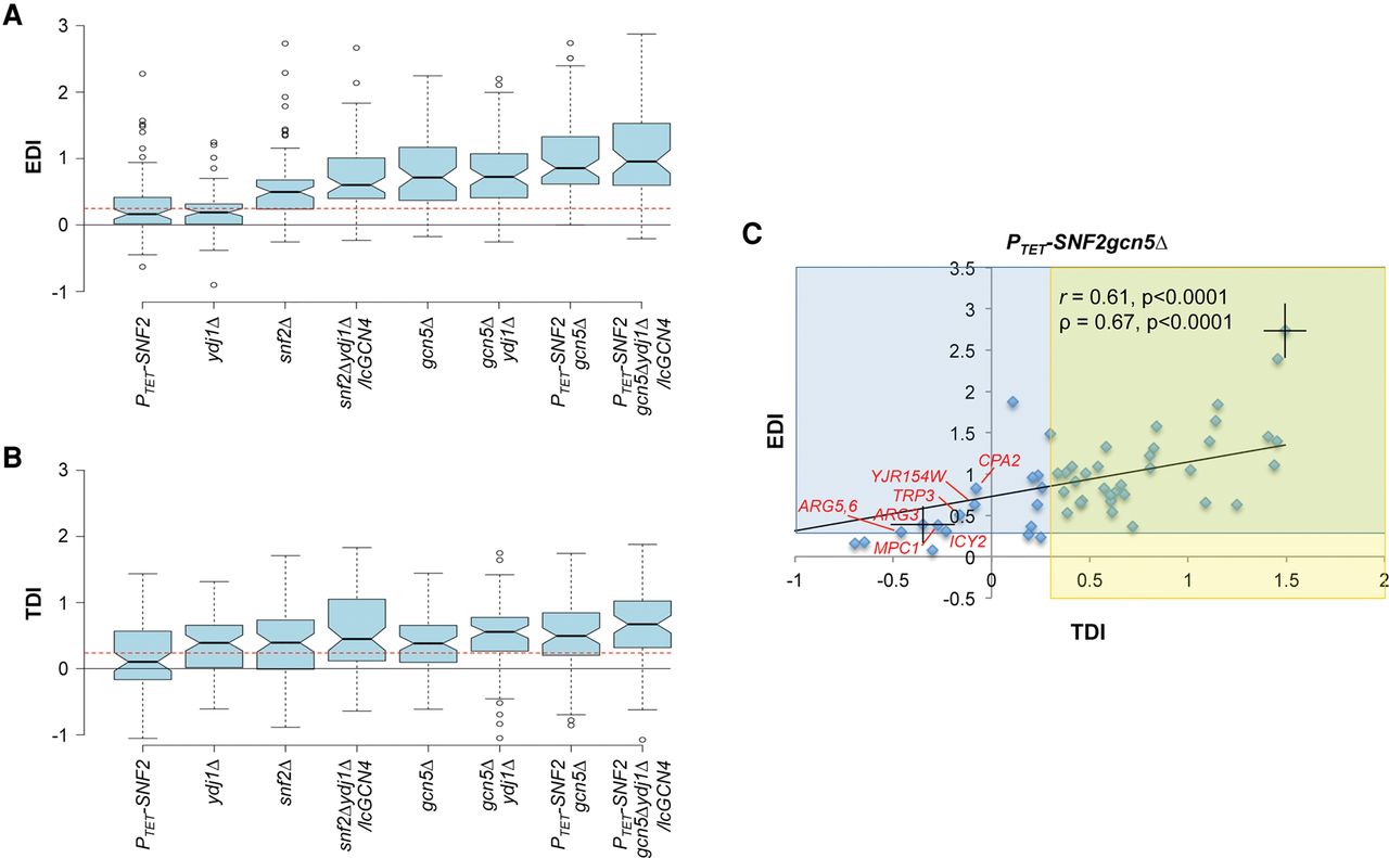 Defects in promoter H3 eviction are associated with defects in Pol II induction for 70 induced exemplar genes. (A,B) Notched-box plots of EDI and TDI values for the 70 exemplar genes in eight mutants (tabulated in Supplemental File S5, sheet 2). EDIs were calculated for each gene from H3 ChIP-seq data from three replicates as (H3I(mut) − H3I(WT))/(H3U(WT) − H3I(WT)), where H3I(mut) and H3U(WT) signify the Avg. H3 Occs. per base pair in the [−1,NDR,+1] regions in induced mutant or WTU cells, respectively. TDIs were calculated similarly for each gene as (RI(WT) − RI(mut))/(RI(WT) − RU(WT)), where R designates average Rpb3 occupancy per base pair in CDS. (C) EDI versus TDI scatterplot for 54 of the group of 70 exemplar genes in PTET-SNF2gcn5Δ cells. Mean EDI and TDI values (±SEM) were calculated for each gene by averaging the EDI or TDI values calculated from H3 or Rpb3 ChIP-seq data from each of three biological replicates (tabulated in Supplemental File S5, sheet 1), and genes with both SEM values <0.25 of the mean EDI and with SEM values <0.125 of the mean TDI values (thus excluding genes CIT2, ACO1, SDH6, LYS21, LYS20, YDR531W, ESBP6, BSC5, UGP1, YBT1, CTT1, HOR7, BAR1, STE2, BAT2, and NRG1) were subjected to correlation analyses to obtain the indicated Pearson's and Spearman's coefficients and P-values. Error bars (±SD) shown for two genes (TPO1 and ARG3) are the largest observed for any of the 54 genes. Yellow and blue zones indicate TDI or EDI values ≥0.3, respectively, and exceptional genes with EDI > 0.3/TDI < 0 are labeled red. Data for RTS3 were not plotted because its large negative EDI value would confine the majority of data points to a small portion of the x-axis.