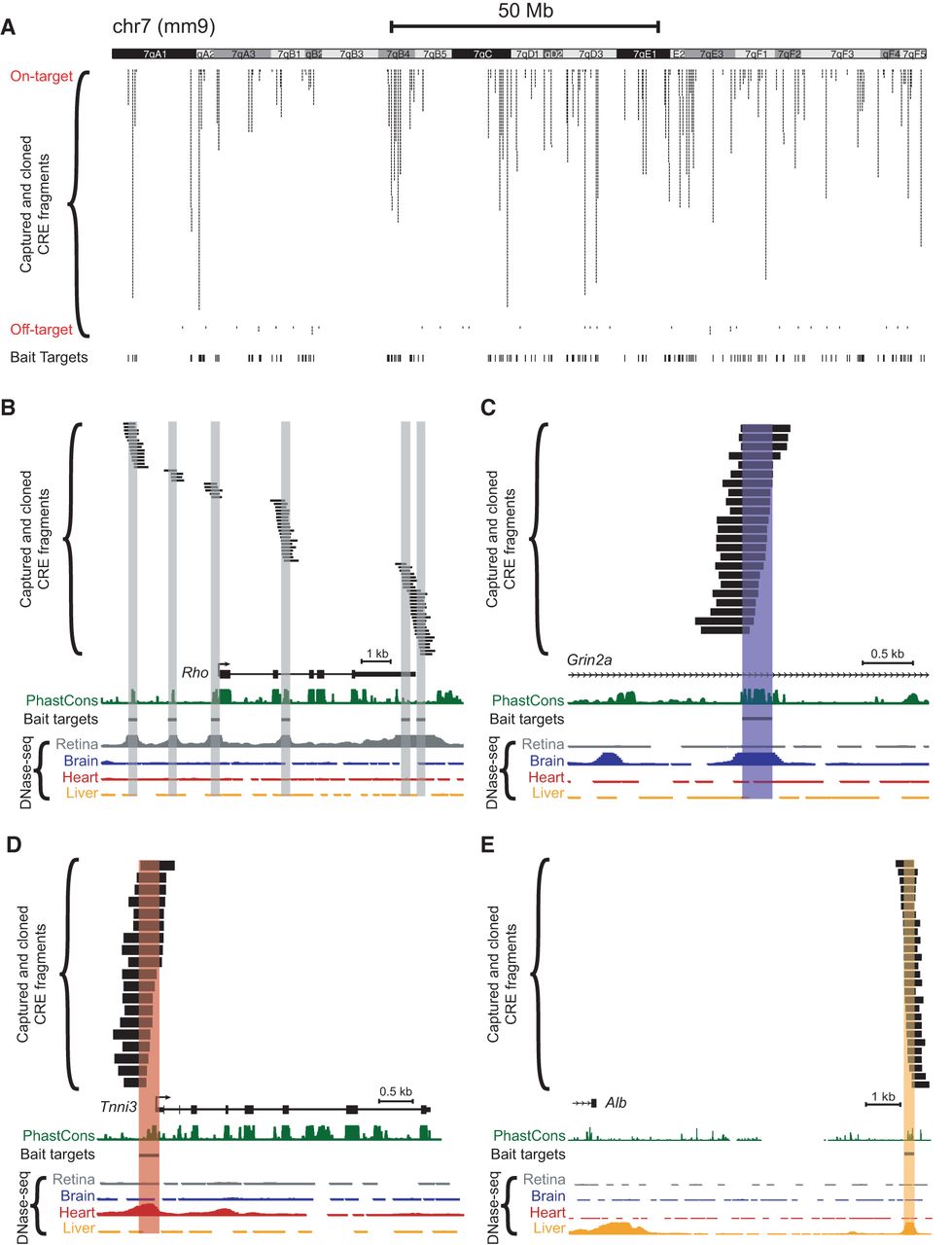 Tiling of captured fragments across target regions. Capture baits were designed based on adult (8-wk-old C57BL/6J) DNase-seq data from Mouse ENCODE (Yue et al. 2014). Paired-end sequencing revealed the locations of individual barcoded, captured-and-cloned fragments. The UCSC Genome Browser (mm9) (Karolchik et al. 2014) screenshots depict: (A) Captured fragments for an entire representative chromosome (Chr 7). Off-target fragments, i.e., those that did not overlap a 300-bp target bait region, are also shown. Examples of captured fragments around a retina-specific locus (B), in an intron of a brain-specific locus (C), in the 5′ UTR/promoter region of a heart-specific locus (D), and downstream from a liver-specific locus (E): (Rho) rhodopsin; (Grin2a) glutamate receptor, ionotropic, NMDA2a (epsilon 1); (Tnni3) troponin I, cardiac 3; (Alb) albumin. Note that some DNase-seq peaks visible in the screenshots were not included as targets for capture. PhastCons depict 30-way vertebrate phylogenetic conservation (Siepel et al. 2005).