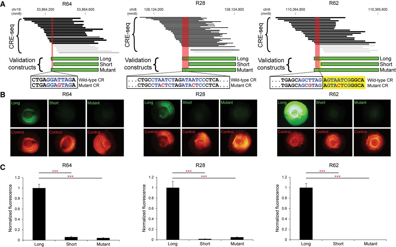 Validation of individual loci by fluorescence reporter assays. (A) Critical regions (red areas) identified by CRE-seq truncation mutation analysis at three retinal DHSs (R64, R28, and R62) were validated by testing of individual constructs with fluorescence reporter assays. Depicted CRE-seq data are based on expression scores averaged across retinal replicates. Note that R64 is the same locus as in Figure 6B. For each locus, a “long” construct containing the critical region (CR), a “short” construct without the critical region, and a “mutant” construct with point mutations (red font) in predicted CRX sites (blue font) were synthesized. Sequences are shown for the plus strand of DNA in all cases. For R62, one CRX site fell within the critical region, and a second CRX site was immediately adjacent (yellow area). Individual test constructs were directionally cloned upstream of the minimal promoter-GFP cassette in a non-AAV vector. The test constructs were coelectroporated into explant retinas with Rho-CBR3-DsRed (Corbo et al. 2010) as a loading control. (B) Representative whole-mount images of electroporated retinas are shown (exposure times are the same for all images). (C) Quantification of the GFP levels normalized to DsRed levels. Error bars represent SEM (n = 10–12 retinas per test construct). (***) P-value <10−6 (two-tailed Student's t-test).