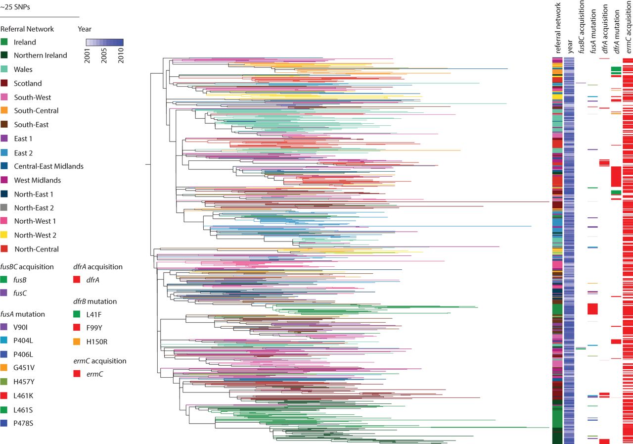 Phylogeny of EMRSA-15 and distribution of antibiotic resistance genes. The maximum likelihood tree of ST22-A isolates was based on core SNPs identified by mapping to the reference ST22 genome HO 5095 0412. The total number of SNP sites present in the core genome alignment in this lineage was 20,488 SNPs. Branches are labeled with colors of the referral networks as indicated by the legend. Represented is the year of isolation, as well as the acquisition of fusB or fusC, fusA mutations, acquisition of dfrA, and dfrA mutations, and ermC acquisition as indicated by the legend.