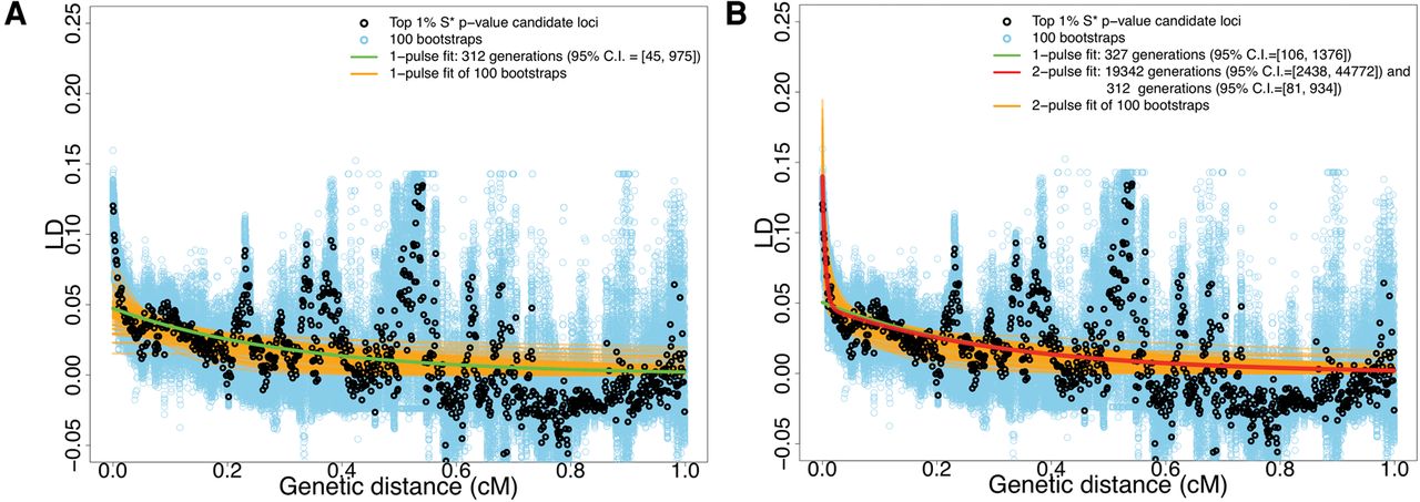 Decay of pairwise LD with respect to genetic distance for SNPs ascertained from the top 1% candidate introgressive loci. Black and blue dots are the average estimated LD among pairs of SNPs binned using genetic distance (in 0.001 cM increments) using real data and 100 bootstraps, respectively. The genetic distance is calculated based on the HapMap Yoruba map (The International HapMap Consortium 2007). For the cases of using the African American map (Hinch et al. 2011), see Supplemental Figure S10. The green curve is the fit of a single exponential using the data, while the red and orange curves are the fits of two exponentials using the real data and 100 bootstraps, respectively. (A) Fitting LD decay within genetic distance 0.02–1 cM. (B) Fitting LD decay within genetic distance 0.002–1 cM.