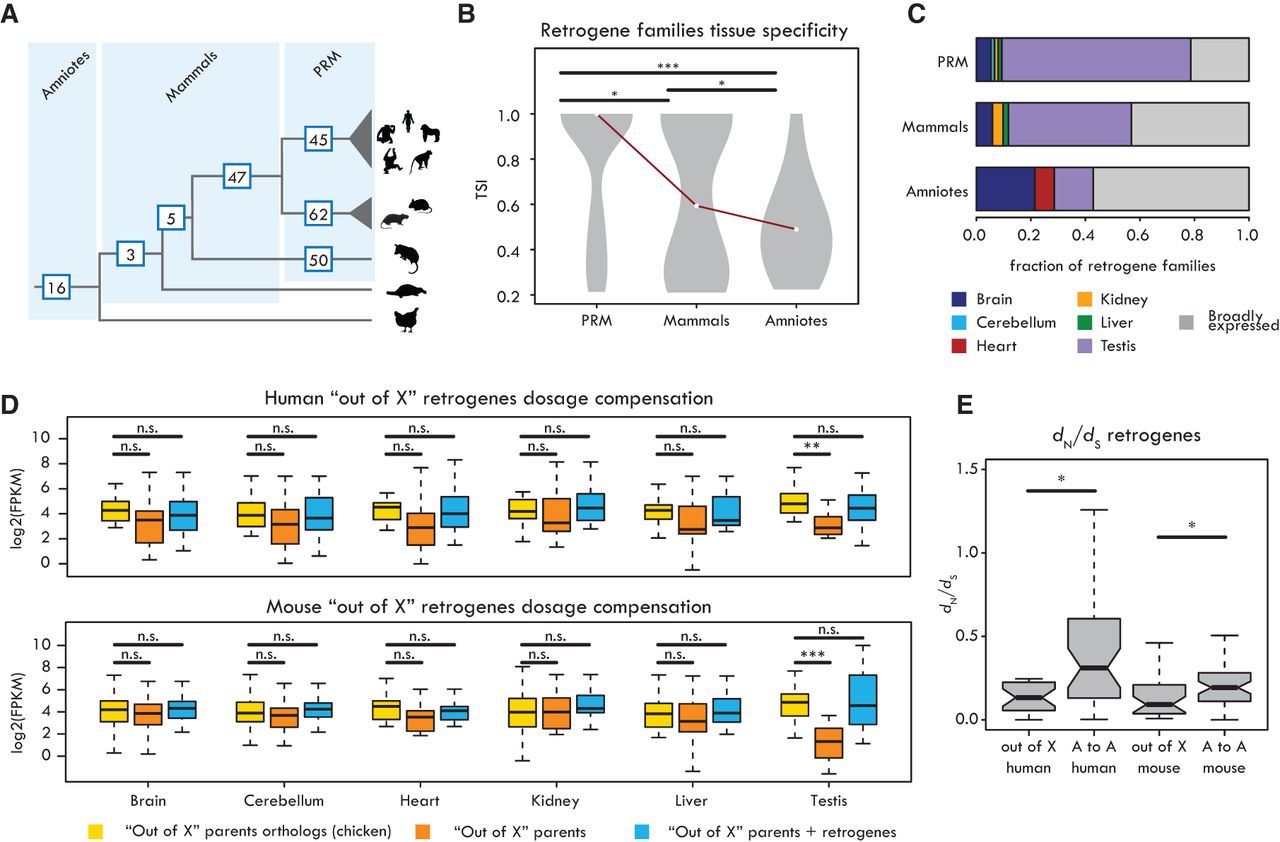 “Out of testis” and “out of X” patterns. (A) Number of retrogene families specific of each clade indicated on the respective branch. (PRM) Retrogenes specific to primates (excluding great ape–specific ones), rodents, or marsupials. (B) Tissue specificity index (TSI) distribution of retrogene families (median TSI of each family) from different evolutionary age categories. Significant differences (Kolmogorov-Smirnov test with Benjamini-Hochberg correction): (***) P < 0.001; (*) P < 0.05. (C) Proportions of retrogenes with tissue-specific (TSI ≥ 0.5) or broad (TSI < 0.5) expression for different age categories. (D) Expression levels of chicken orthologs of parental genes of “out of X” retrogenes (yellow), “out of X” parental genes (orange), and combined expression of “out of X” retrogenes and parental genes (blue) in human (19 retrogenes) and mouse (23 retrogenes). Retrogenes compensate for the significant decrease in parental gene expression only in testis. Significant differences (Wilcoxon signed-rank test with Benjamini-Hochberg correction): (***) P < 0.001; (**) P < 0.01; (n.s.) P > 0.05. (E) dN/dS ratios between “out of X” and “autosome to autosome” (“A to A”) retrogenes in human and mouse. Significant differences (Mann-Whitney U test with Benjamini-Hochberg correction): (*) P < 0.05. Whiskers up to 1.5 times the interquartile range; outliers are removed for graphical purposes.