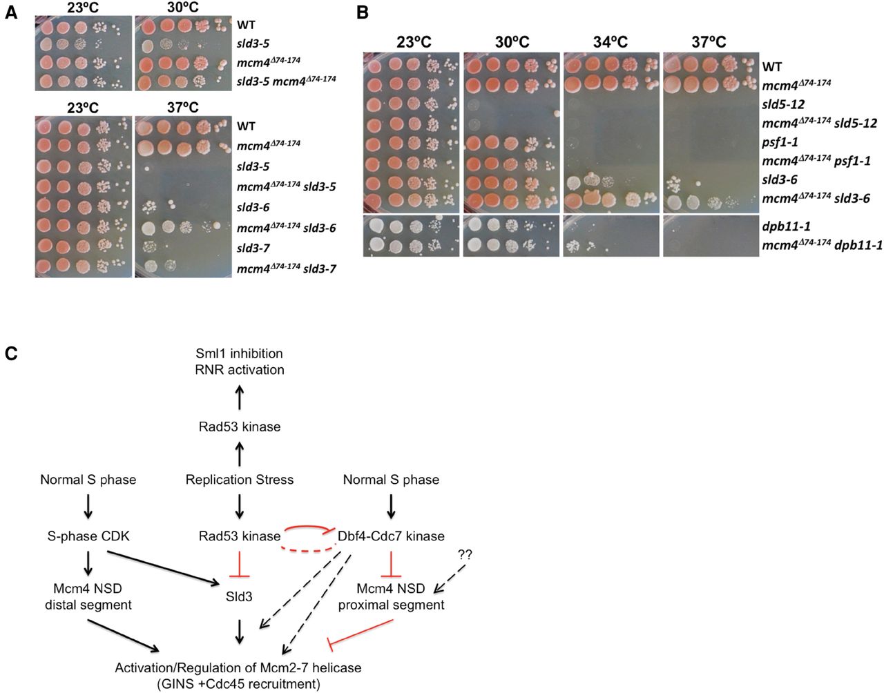 Partial suppression of sld3-ts by the mcm4Δ74-174 mutant. (A,B) Serial 10-fold dilution of 105 yeast cells on YPD at the indicated temperatures. (C) A model for control of Mcm2-7 helicase.