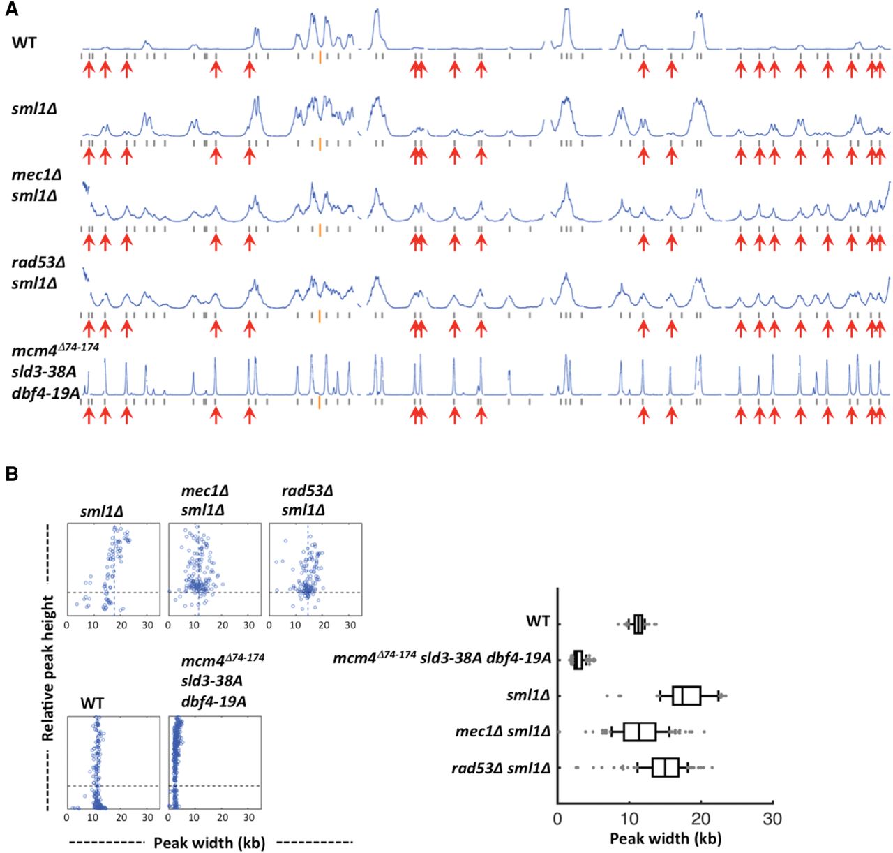 Late origin firing in HU in the absence of checkpoint signaling kinase. Yeast cells were synchronized in G1 phase and released into YPD containing 0.2 M HU and 0.5 mM EdU for 90 min. (A) Replication profiles of Chromosome IV for WT, sml1Δ, mec1Δ sml1Δ, rad53Δ sml1Δ, and the mcm4Δ74-174 sld3-38A dbf4-19A triple mutant cells. (B) Distribution of fork progression from origins shown as individual width–height plots and box graph, excluding peaks with heights <30% of the maximal height scale.
