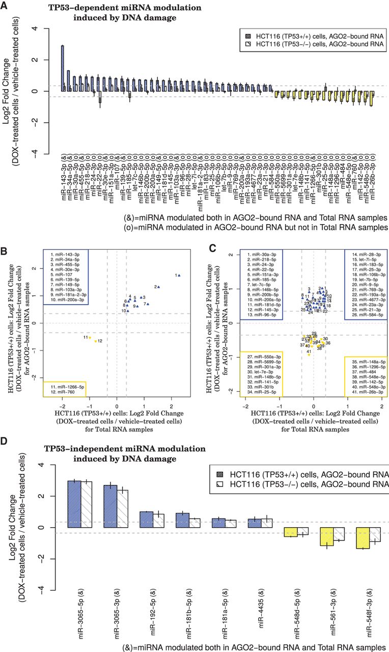 TP53 is required for DNA damage–induced modulation of the association between AGO2 and a subset of miRNAs. (A) Bar plot of fold changes for 53 miRNAs exhibiting statistically significant (Benjamini-Hochberg adjusted Student's t-test P-value < 0.05) differential expression of small RNAs isolated from immunoprecipitated AGO2 after DOX treatment. In some cases (12/53 miRNAs marked by an “&” symbol in the bar plot x-axis labels), the observed changes in levels of AGO2 binding reflect changes in abundance in total RNA induced by the treatment. In other cases (41/53 miRNAs marked by an “o” symbol in the bar plot x-axis labels), however, the observed changes in AGO2 binding occur in the absence of changes in abundance in total RNA. (B) Scatterplot showing miRNAs that change significantly in both the AGO2-immunoprecipitation and total RNA samples (HCT116 TP53+/+ cells). (C) Scatterplot showing miRNAs that significantly change in the AGO2-immunoprecipitation but not in the total RNA samples (HCT116 TP53+/+ cells). (D) Bar plot of fold changes for nine miRNAs exhibiting statistically significant (Benjamini-Hochberg adjusted Student's t-test P-value < 0.05) and TP53-independent changes in expression. For these miRNAs, changes in AGO2 binding reflect changes in abundance in total RNA (9/9 miRNAs marked by an “&” symbol in the bar plot x-axis labels). In A and D, each bar represents the mean and standard deviation of three biological replicates. In B and C, thicker dotted gray lines indicate the selected log-fold change cutoff (0.35), and thinner dotted gray lines indicate a log-fold change equal to 0.