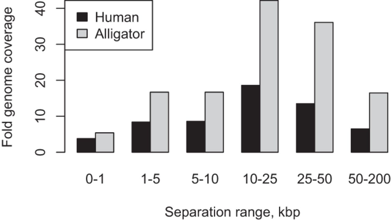 Genome coverage (sum of read pair separations divided by estimated genome size) in various read pair separation bins.