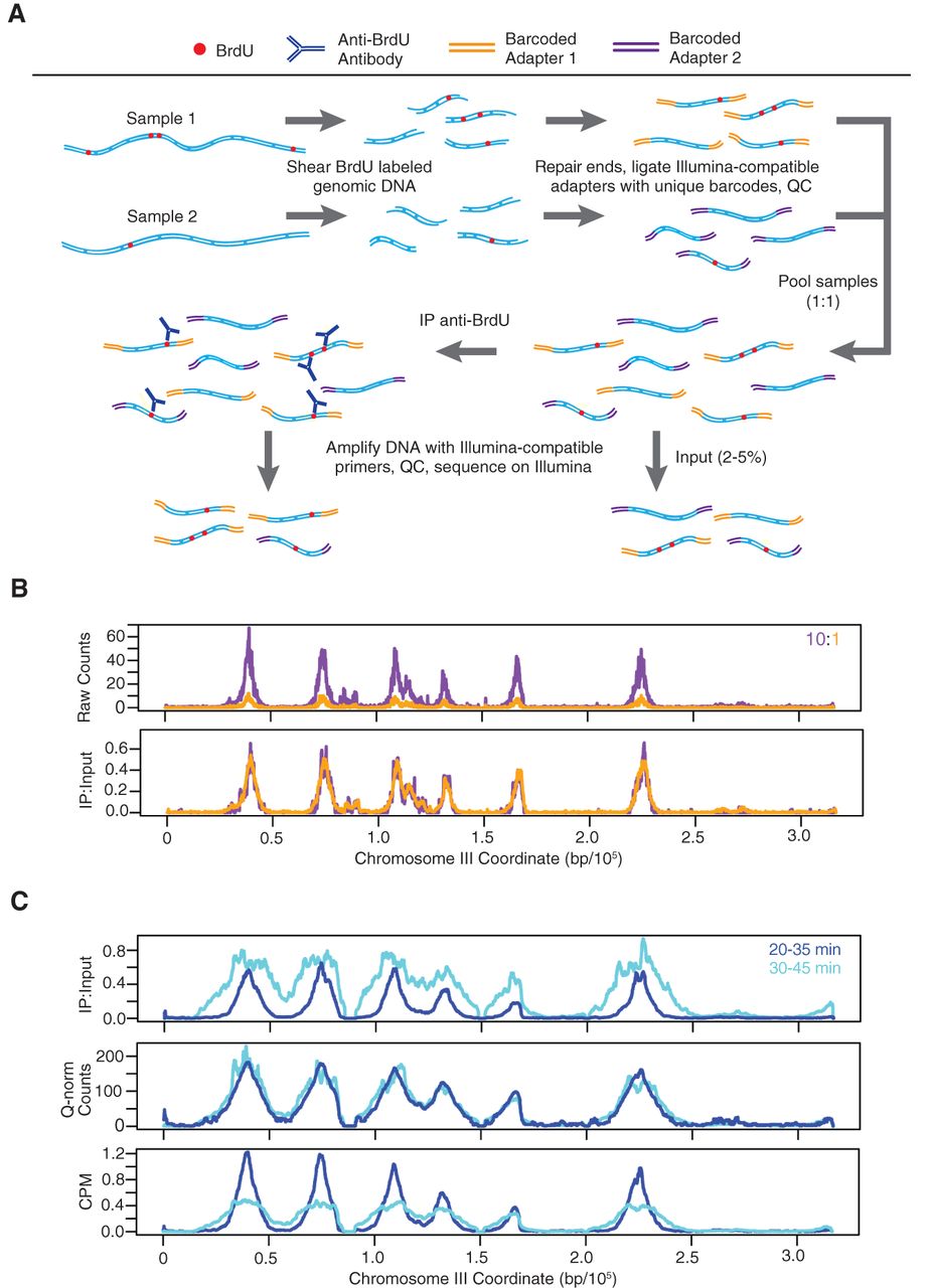 Quantitative BrdU-IP-seq analysis. (A) Scheme of the method. BrdU-labeled genomic DNA from each sample is barcoded by end-ligation of Illumina-compatible linkers. Samples are pooled, a small fraction of this pool is set aside as “Input,” and the remainder is subjected to immunoprecipitation (IP) with anti-BrdU antibody. The IP and Input samples are PCR-amplified with indexed primers and sequenced. IP sample reads are normalized against Input sample reads. (B) Validation of the method. A BrdU-labeled genomic DNA sample was split in two and each aliquot was uniquely barcoded. The distinctly barcoded samples were pooled at a ratio of 1:10 (color-keyed) and processed as above. IP results are shown raw and with normalization against the Input. (C) Comparison to CPM and Quantile normalization (Q-norm). JPy88 (WT) cells were synchronized in G1 phase with α-factor, released into S phase, and aliquots were incubated with BrdU for the indicated time intervals and harvested. The samples were processed as described for qBrdU-seq in A, and the IP sequence reads were analyzed by qBrdU-seq, CPM, or Quantile normalization and plotted as overlays of the time points.