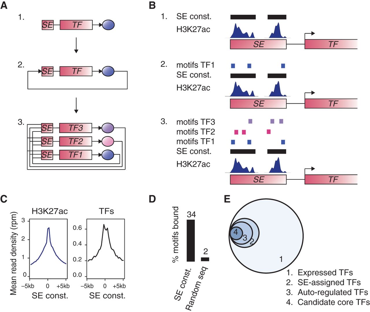 A method to build core regulatory circuitry. (A) Graphical description of the method used to create core regulatory circuitry (CRC) models. 1. Identification of SE-assigned expressed TFs. 2. Identification of the TFs that are predicted to bind their own SE, considered as auto-regulated. 3. CRCs are assembled as fully interconnected loops of auto-regulated TFs. (B) Cartoon showing: 1. TF-assigned SE constituents defined by H3K27ac ChIP-seq peak signals; 2. TFs having at least three DNA-binding sequence motif instances in their SE constituents are considered auto-regulated; 3. TFs with SEs having at least three DNA-binding sequence motif instances for each of the other predicted auto-regulated TFs together form an interconnected auto-regulatory loop. (C) Metagenes for the ChIP-seq signal for H3K27ac (left) and for the average ChIP-seq signal for POU5F1, SOX2, and NANOG (right) in H1 hESCs in the region ±5 kb around the center of the SE constituents. (D) Average percentage of DNA-binding motifs that are actually bound by the TFs from ChIP-seq data for POU5F1, SOX2, and NANOG in H1 hESCs, in either SE constituents or sets of random genomic sequences of the same size. (E) Venn diagram showing the average numbers, across 84 samples, of: 1. TFs having motifs that are expressed (445 TFs); 2. TFs having motifs that are expressed and assigned to a SE (61 TFs); 3. TFs having motifs that are expressed and assigned to a SE and that are predicted to bind their own SE (39 TFs); 4. TFs that are part of the CRC model (15 TFs).