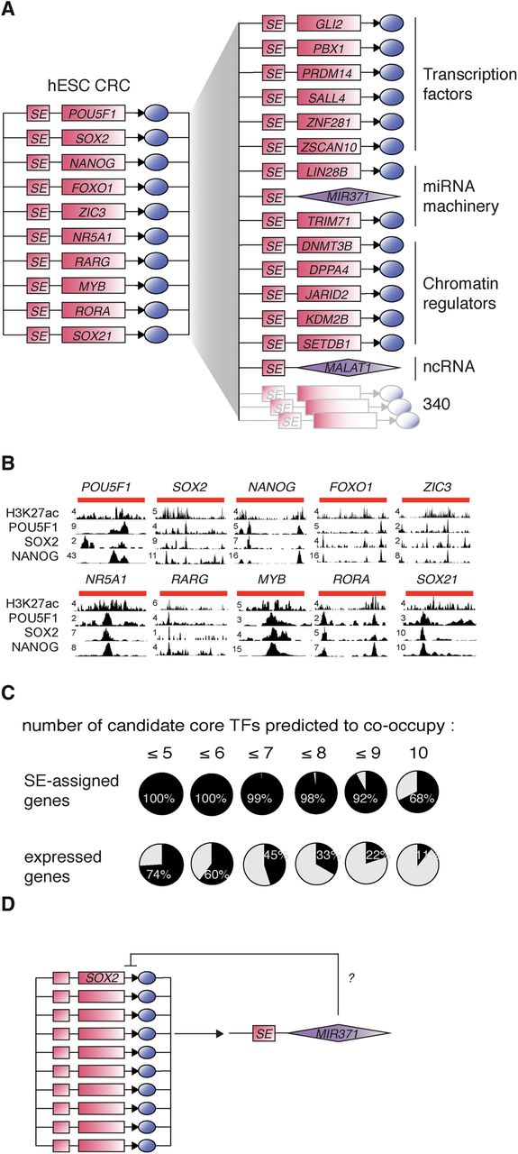 H1 ESC core and extended regulatory circuitry. (A) (Left) CRC model for H1 human embryonic stem cells. The role of each TF in ESC pluripotency and self-renewal is listed in Table 1. (Right) H1 hESC extended regulatory circuit. Examples of SE-assigned genes that are predicted to be bound by each of the TFs in the CRC. The role of these factors in ESC pluripotency and self-renewal is listed in Supplemental Table S5. (B) ChIP-seq data for H3K27ac, POU5F1, SOX2, and NANOG showing binding of the TFs to each of the SEs of the SE-assigned TFs in the hESC CRC. SE genomic locations are depicted by red lines on top of the tracks. (C) Pie charts showing the percentages of SE-assigned genes (top row) or all expressed genes (bottom row) whose regulatory sequences are predicted to be bound by increasing numbers of hESC candidate core TFs. (D) Diagram showing putative transcriptional regulation of miR-371a on SOX2 expression in hESCs.