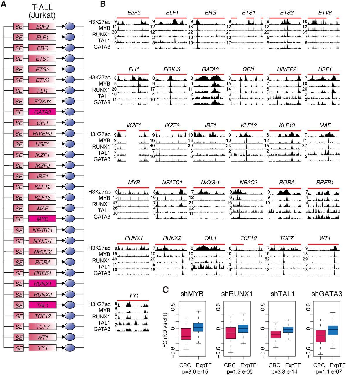 Experimental validation for T-ALL Jurkat cell circuitry. (A) Core regulatory circuit containing GATA3, MYB, RUNX1, and TAL1 for T-ALL Jurkat cells. (B) ChIP-seq data for H3K27ac, MYB, RUNX1, TAL1, and GATA3 showing binding of the TF to each of the SEs in the T-ALL Jurkat cell core circuit. SE genomic locations are depicted by red lines on top of the tracks. (C) Boxplots showing fold change (FC) in expression for Jurkat cells transfected with the indicated shRNAs vs. control shRNAs, for either the set of candidate core TFs displayed in A (red) or the full set of TFs considered expressed in Jurkat cells (blue). P-values quantifying the difference between the two sets were calculated using a Wilcoxon test.