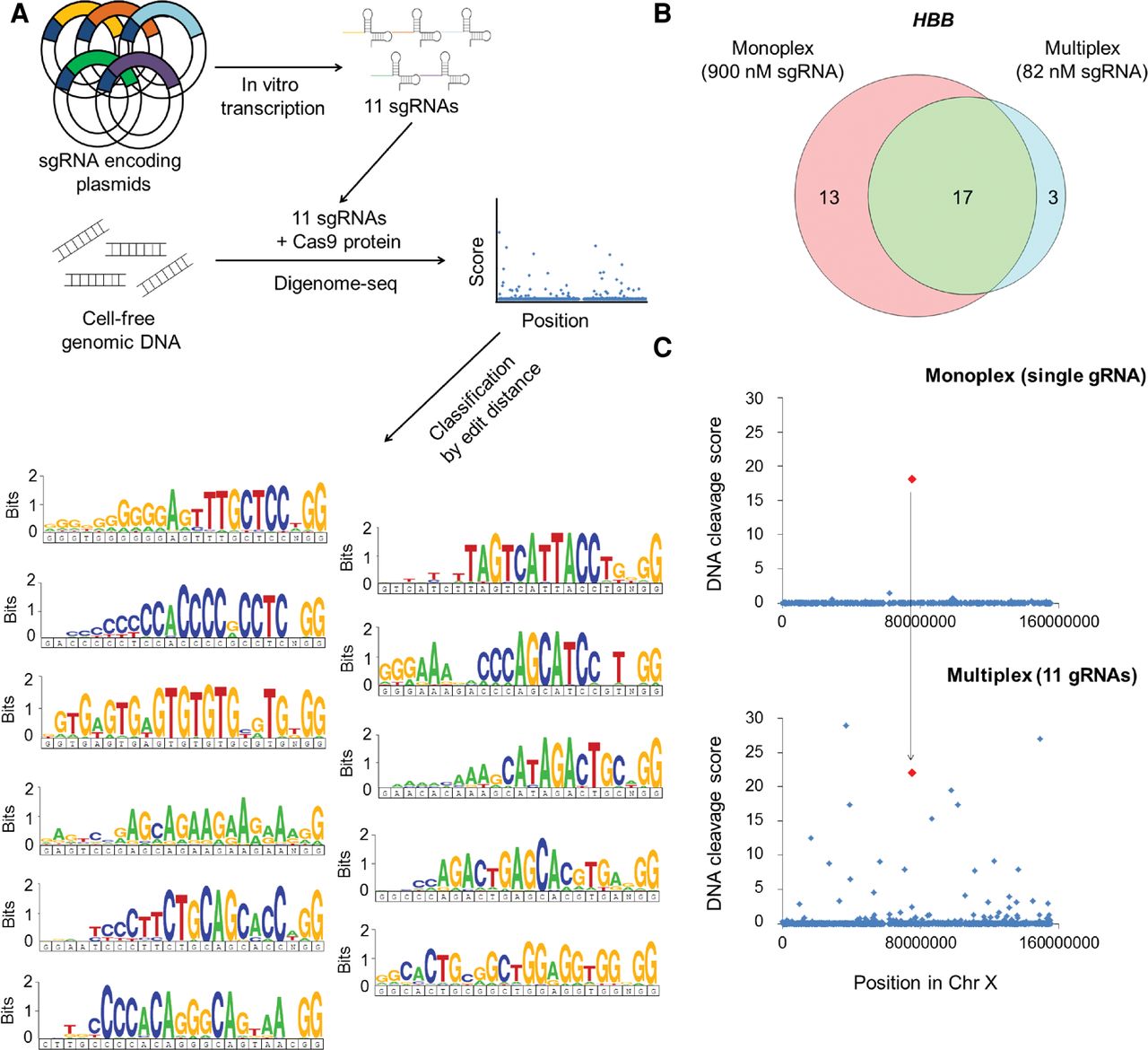 Multiplex Digenome-seq. (A) Schematic overview of multiplex Digenome-seq. (B) A Venn diagram showing the number of in vitro cleavage sites captured by monoplex and multiplex Digenom-seq analyses. (C) In vitro DNA cleavage scores across Chromosome X obtained by monoplex or multiplex Digenome-seq.