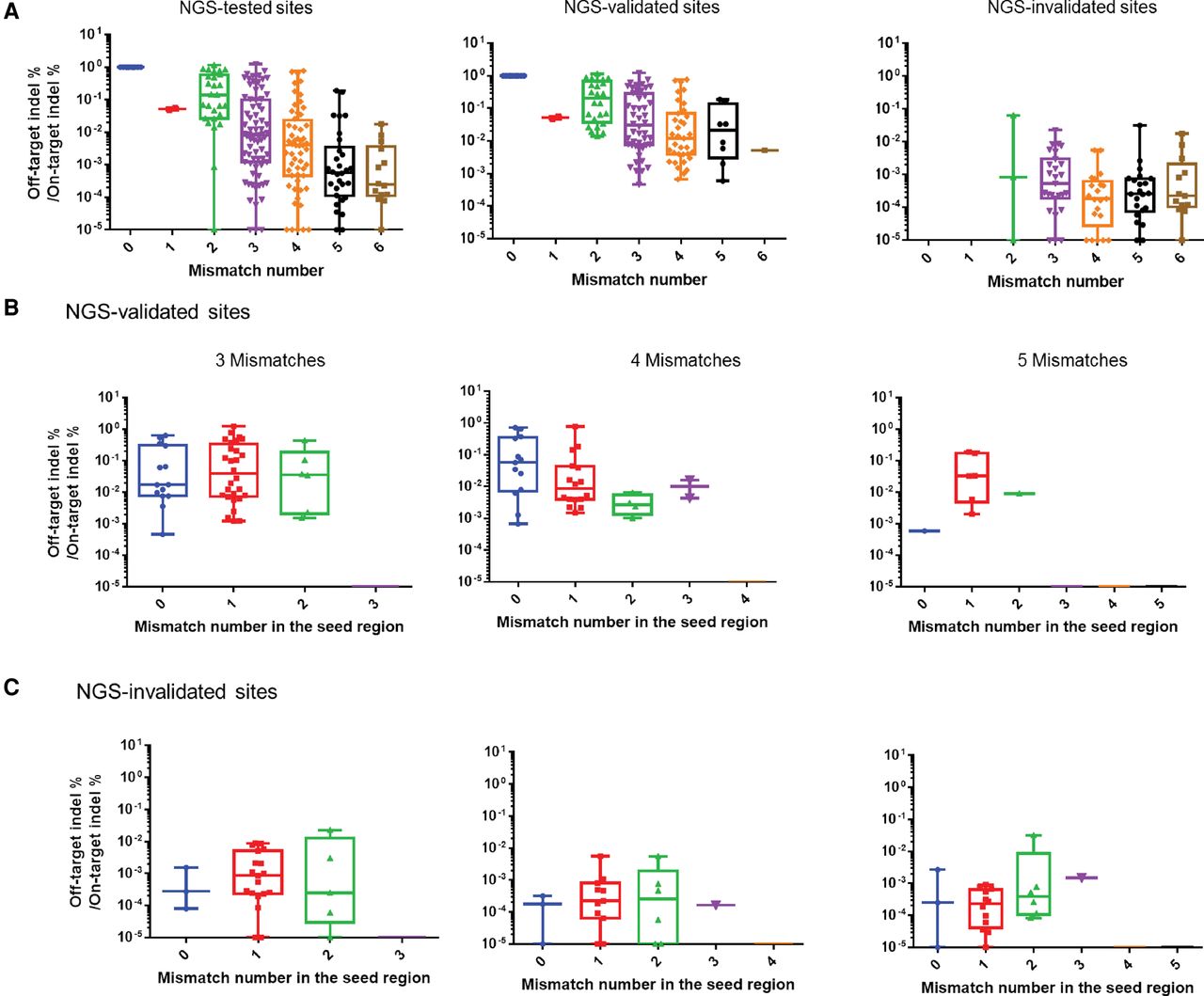 Analysis of NGS-validated and NGS-invalidated off-target sites. Plots of relative indel frequencies (log scale) at off-target sites harboring the number of mismatches indicated in the entire 20-nt sequence (A) or the 10-nt seed sequence (B,C). NGS-tested sites (A) were divided into two groups: validated sites (B) and invalidated sites (C). NGS-validated sites and NGS-invalidated sites were those with indel frequencies above and below, respectively, noise indel levels.