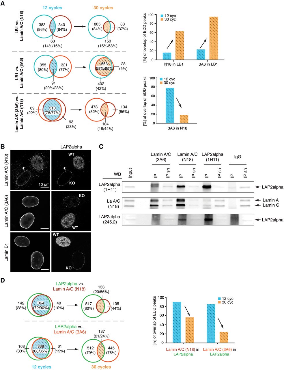 LAP2alpha and Lamin A/C overlap in euchromatic regions. (A) Venn diagrams of genome-wide overlapping EDD peaks (Mb) of lamin B1 and lamin A/C samples upon 12 and 30 cycles of sonication. Overlaps (hatched) of lamin A/C-3A6 and -N18 with lamin B1 and overlaps of lamin A/C-3A6 with -N18 are highlighted in light blue (12 cycles) and light orange (30 cycles), and the corresponding % of overlap of EDD peaks are depicted as bar graphs. (B) Confocal immunofluorescence microscopic images of a mixed culture of Tmpo WT and KO mouse dermal fibroblasts double-stained for LAP2alpha and lamins as indicated. Unstained nuclei in LAP2alpha panels are outlined by a white dashed line. Scale bar, 10 µm. (C) Co-IPs for lamin A/C-3A6, lamin A/C-N18, and LAP2alpha were performed in Tmpo WT imMDFs. Normal rabbit IgG was used as a negative control. (D) Venn diagrams of genome-wide overlapping EDD peaks (Mb) of LAP2alpha and Lamin A/C samples upon 12 and 30 cycles of sonication. Overlaps (hatched) of LAP2alpha with lamin A/C-3A6 and -N18 are highlighted in light blue (12 cycles) and light orange (30 cycles), and the corresponding % of overlap of EDD peaks are depicted as bar graphs.