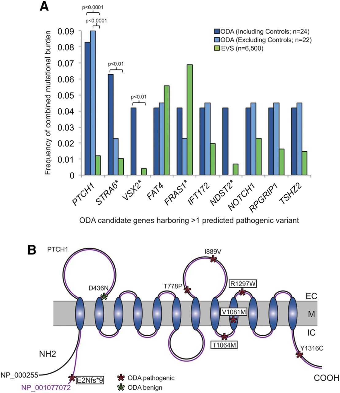 PTCH1 has a significantly enriched mutational burden in ocular developmental anomalies (ODA). (A) Mutational burden for all genes harboring >1 rare predicted pathogenic variants in the initial cohort of ODA compared to healthy control individuals from the Exome Variant Server (EVS). Frequency of combined mutational burden is shown for the 10 genes harboring multiple rare (<1% alternate allele frequency) functional variants (frameshift, nonsense, and splicing variants were considered as damaging; missense variants were classified as damaging or not based on PolyPhen-2) in either ODA cases including two positive controls (n = 22 unknown + 2 positive controls; dark blue bars), or ODA test cases alone (n = 22 unknown; light blue bars) vs. EVS controls (n = 6500; green bars). P-values are indicated for the only three genes with a significant enrichment in cases versus controls (χ2 test). (*) VSX2 and STRA6 are previously identified causal genes in the positive control ODA samples, C1 and C2, respectively; C1 also harbored variants in FRAS1 and NDST2. (B) Schematic representation of the PTCH1 receptor with its extracellular (EC), transmembrane (M), and intra-cellular domains (IC). The positions of the PTCH1 mutations identified in ODA are represented with asterisks, with the color indicating variant pathogenicity. The four variants enclosed with boxes were identified in the initial discovery cohort. p.E2Nfs*9 is specific to isoform NP_001077072 (purple), which is identical to NP_000255 (black) except for an alternate 66 amino acid region at the N terminus.