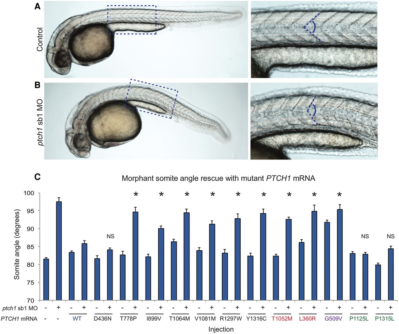 PTCH1 variants identified in ODA patients are pathogenic. (A,B) Representative lateral images of uninjected control and ptch1 sb1 MO-injected live embryos taken at 36 h post-fertilization (hpf); dashed boxes are enlarged in the insets (right). Magnified panels show chevron-shaped somites (controls) and abnormal-shaped somites (morphants), caused by aberrant Hedgehog signaling in the zebrafish myotome. Dashed blue lines indicate measurement position (at the midpoint between the proximal hindgut and the anus) used for phenotypic scoring of embryo batches. (C) All six nonsynonymous PTCH1 variants identified in ODA cases were pathogenic as indicated by the inability of mutant mRNA to rescue the ptch1 MO-induced somite angle defects. PTCH1 p.Thr1052Met, a rare variant (minor allele frequency in controls 0.001; n = 13,006 chromosomes [EVS]) reported previously in HPE, is also pathogenic; p.Leu360Arg is a previously reported functional null. Rescue with a common PTCH1 p.Pro1315Leu encoding variant (rs357564; present in homozygosity in 8% of controls; n = 12,568 chromosomes in EVS) was not significantly (NS) different from wild type (WT), nor was a previously reported benign variant p.Pro1125Leu change, providing support for the specificity of the assay. p.Gly509Val is a positive control for dominant negative effects. The missense variant p.Asp436Asn identified in the ODA control C2 was benign in this assay. We measured 38–58 embryos per injection batch with blind scoring. Asterisks indicate statistical differences between mutant and WT rescue (P < 0.0001; Student's t-test). Error bars, SEM. See Supplemental Table 7 for somite measurement data.