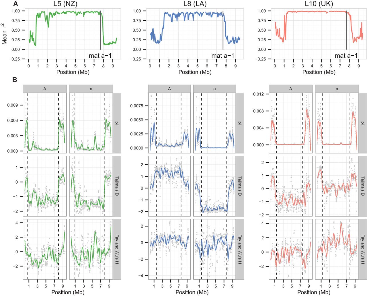 Patterns of genetic variation across the mat chromosome for N. tetrasperma lineages L5, L8, and L10. (A) Linkage disequilibrium given as the mean Pearson's correlation coefficient (r2). The vertical black line shows the position of the mat a locus in the 2509 reference genome. (B) Nucleotide diversity (π), Tajima's D (Tajima 1989), and Fay and Wu's H (Fay and Wu 2000). For all variables, we used a 100-kb window size (step size 20 kb). The values for each window are represented by the gray points, and smooth lines were plotted with stat_smooth in the ggplot2 R package using the gam method with a span of 0.2. Dashed vertical lines indicate lineage-specific limits of the SR region.