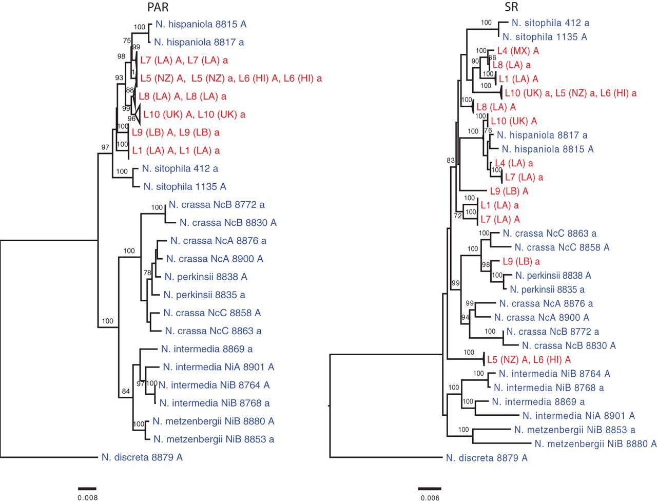 The phylogenetic relationships of Neurospora strains in the PAR and SR regions common to all N. tetrasperma lineages. The SR tree was reconstructed from a concatenated data set of six genes and the PAR tree from two genes (see Supplemental Table 12). The heterothallic species are in blue, and N. tetrasperma lineages in red. Numbers on the branches are bootstrap support values expressed as a percentage; values below 70 are not shown.