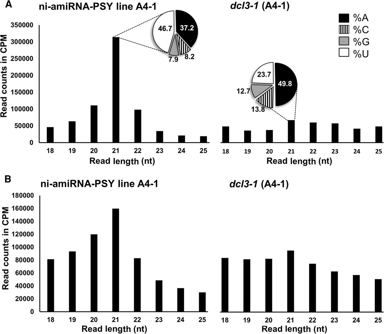 Effect of dcl3 mutation on C. reinhardtii small RNA population. (A) Size-distribution histograms of sRNAs from the parental line A4-1 and its derivative dcl3-1 mutant expressed as the number of counted reads of a given size per million (CPM) of reads matching the C. reinhardtii genome. The percentage of 21-nt sRNAs with their 5′ nucleotide identities is also shown. (B) Size-distribution histograms of nonredundant sRNAs from the parental line A4-1 and its derivative dcl3-1 mutant expressed as CPM of reads matching the C. reinhardtii genome. Two additional replicates per sample, as well as three replicates from the E9-3 parental and dcl3-3 lines, showed the same result.