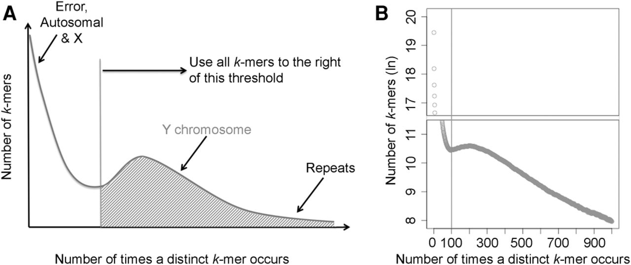 RecoverY—a novel algorithm for extracting Y Chromosome–specific reads from sequences of flow-sorted material. (A) The expected distribution of k-mer abundances. (B) The abundance of k-mers from paired-end flow-sorted gorilla Y sequencing data. The k-mers with an abundance greater than 100 are considered to be Y-specific or repetitive.
