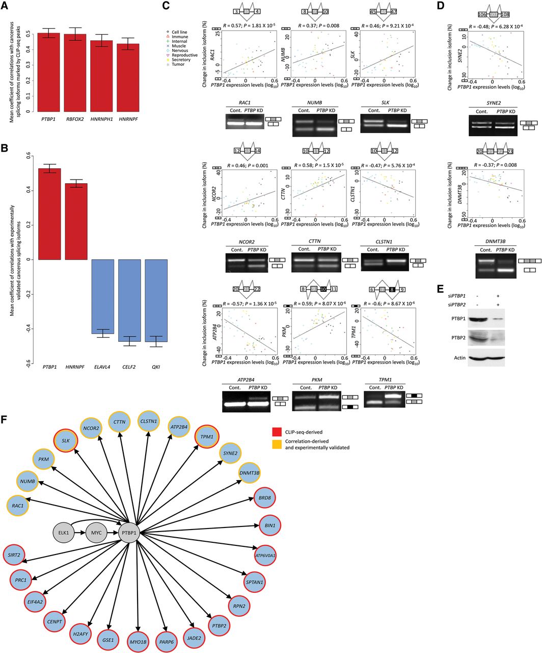 PTBP1 promotes colon tumorigenesis-triggering splicing isoforms. (A) Mean Pearson coefficients of ELK1 subnetwork alternative splicing factor gene expression correlations with splicing changes of all cancerous isoforms bound by these factors. Genes displaying fewer than five statistically significant correlations were omitted. Error bars, SEM. (B) The five highest ranking mean Pearson coefficients of alternative splicing factor gene expression correlations with the splicing changes of experimentally validated cancerous splicing isoforms. Error bars, SEM. (C,D, top) Per each alternative splicing event predicted to be regulated by PTBP1, the Pearson correlation between PTBP1 gene expression and the change in inclusion splice form across 48 human tissues and cell lines is depicted. Tissue and cell line groups are represented by different symbols. Each diagram depicts exon positions and the possible transcripts arising from the alternative splicing event. (Bottom) RT-PCR analysis of the alternative splicing event in HCT116 cells treated with either control siRNA (Cont.) or siRNA directed against PTBP1 and PTBP2 (PTBP KD) is presented as well. PKM and TPM1 RT-PCR products were digested with PstI. (E) HCT116 cells were transfected with control siRNA or siRNA directed against PTBP1 (siPTBP1) and PTBP2 (siPTBP2), and later cell extracts were subjected to Western blot analysis with the indicated antibodies. (F) Pathway connecting ELK1 with genes including PTBP1-affected and PTBP1-bound exons exhibiting splicing pattern changes in the colon tumor compared with the normal colon (genes colored light blue; other proteins are colored gray). Genes including exons derived from the analysis in B and validated in C and D are marked by yellow borders. Genes including PTBP1-bound exons are marked by red borders.