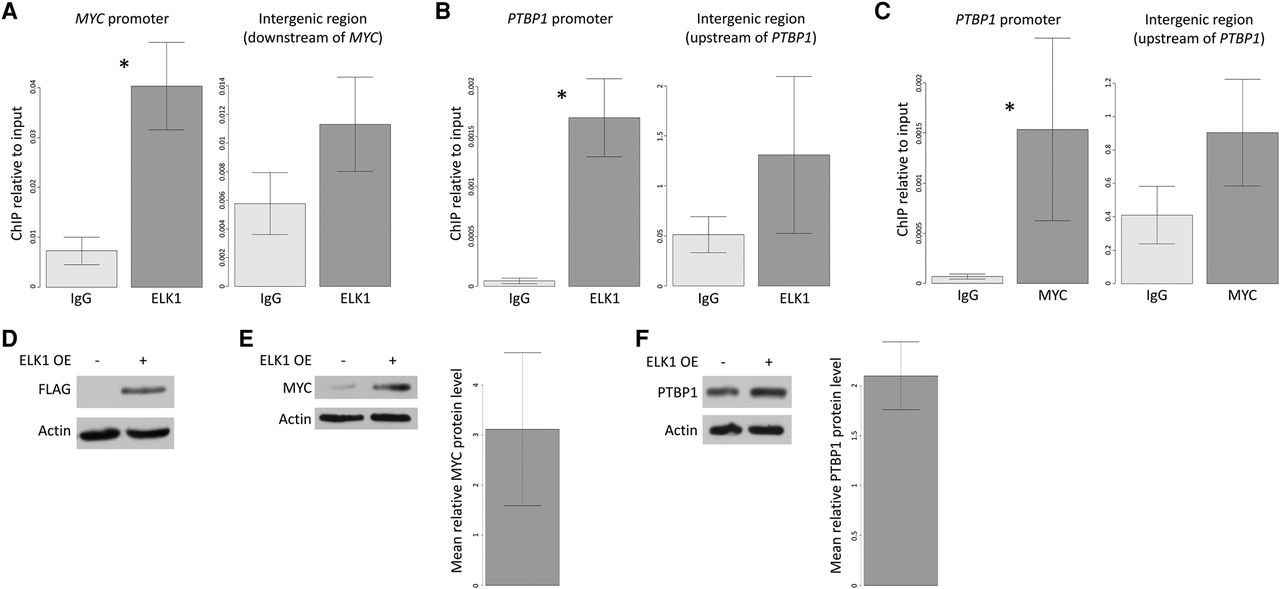 ELK1 activates a regulatory pathway that involves MYC and PTBP1. (A–C) HCT116 cells were subjected to ChIP with antibodies against ELK1 (A,B) or MYC (C). Immunoprecipitated DNA was quantified by qPCR with primers specific to the MYC (A) and PTBP1 (B,C) promoter regions as well as intergenic regions used as negative controls (Supplemental Methods). Bars, mean values of four (A,B) or five (C) independent experiments normalized to input (Supplemental Methods). Error bars, SEM. Asterisks indicate P = 0.002, P = 0.001, and P = 0.004, respectively; one-sided Student’s t-test. (D–F) HCT116 cells were transfected with a plasmid containing cDNA encoding ELK1 (ELK1 OE) or an empty vector in three independent experiments. Cell extracts were subjected to Western blot analysis with the indicated antibodies. Relative protein levels were quantified using ImageJ (Schneider et al. 2012). Error bars, SEM.
