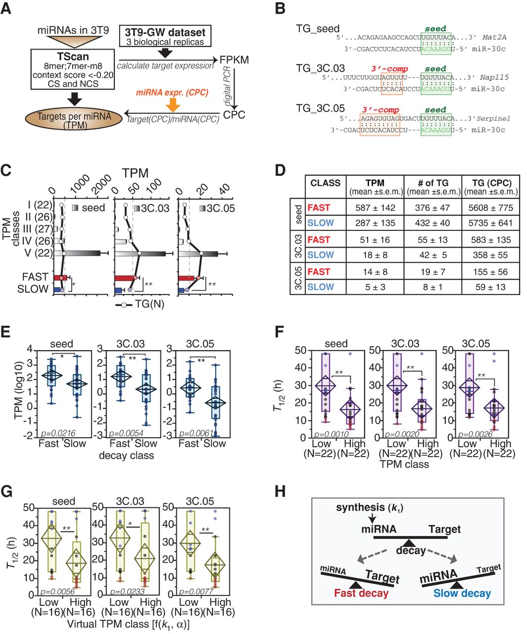 miRNA targets and decay. (A,B) Scheme of strategy used for the target:miRNA ratio calculation. Targets of miRNAs were further distinguished according to their complementarity to the miRNA 3′ end. (TG_seed) Seed interaction; (TG_3C) seed plus 3′ compensatory site with moderate (3C.03) or extensive (3C.05) interaction. Examples are reported in panel B. (C,D) The bar graph (C) and the table (D) summarize the TPM, the number of targets [TG (N)], and their level of expression in “fast” versus “slow” miRNA classes. (*) P < 0.05; (**) P < 0.01; Wilcoxon test. (E) Box-plots show the distribution of the target:miRNA ratios (TPM, distinguished according to target complementarity as shown in B) in “fast” versus “slow” miRNAs. (F,G) miRNA half-life (T1/2) distribution within low (<20th Pctl) or high (>80th Pctl) TPM (F) or virtual TPM (G) miRNA classes. Virtual TPMs were calculated using transcription rate (k1) and cell doubling time (α) data. (H) The scheme summarizes the mutual relationship between targets, miRNA synthesis, miRNA expression levels and miRNA turnover rates. (E–G) P-values were calculated by Wilcoxon test.