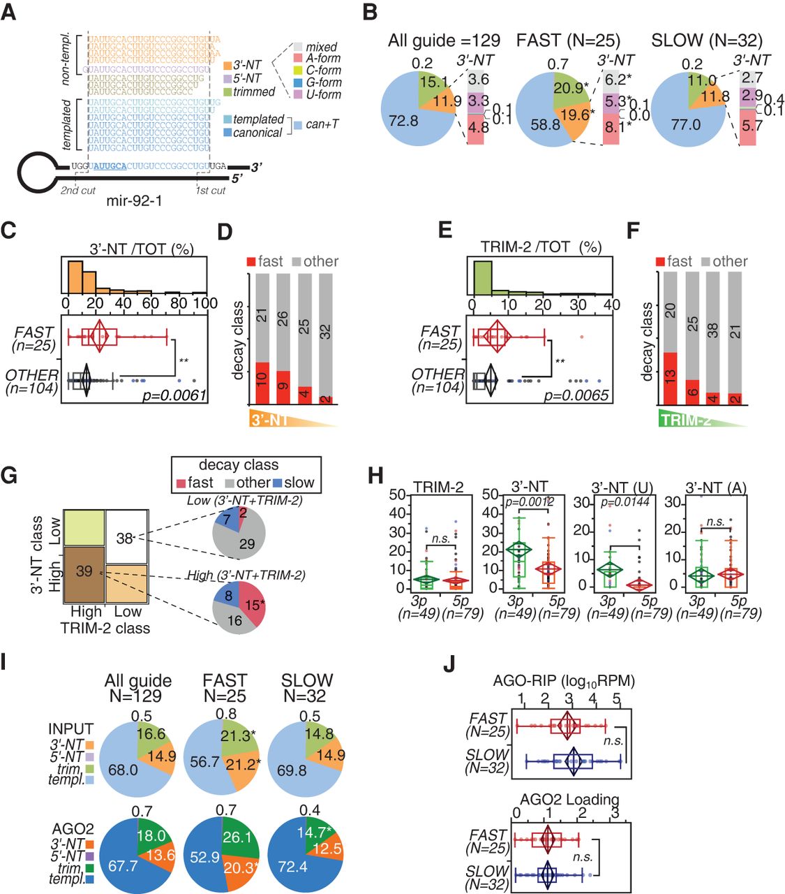 miRNA isoforms (isomiRs) and decay. (A) The scheme illustrates the type of isomiRs that are generated starting from mouse mir-92-1, which is used as the model. Dashed lines mark the two cuts (by DROSHA and DICER1) that generate the “canonical” mature miR-92a-1-3p. Alternative cuts originate “templated” (T) isoforms, while tailing by terminal transferases produces nontemplated (NT) species, which are further distinguished according to the nucleotide added. (B) The pie charts show the frequency of isomiRs for all the guide miRNAs included in the decay data set or just those of the “fast” and “slow” subsets. Data refer to the average of three independent sequencing experiments (shown in Supplemental Fig. S3A,B). Asterisks mark significant values (P < 0.001, paired t-test). (C,E) Distribution of 3′-NT isoforms (C) or trimmed isoforms (“Trim-2,” which includes only species shortened by at least two bases) (E) between “fast” and nonfast (other) miRNA subsets. (**) P < 0.01, Wilcoxon test. (D,F) Guide miRNAs were distinguished into classes (quartiles) according to the amount of 3′-NT (D) or Trim-2 (F) modifications and were correlated with “fast” decay by contingency analysis (3′-NT χ2 = 9.6, P = 0.0235; Trim-2 χ2 = 12.1, P = 0.0069). (G) Co-occurrence of 3′-NT and Trim-2 modifications determined by contingency analysis (χ2 = 5.35, P = 0.0207). The two classes with concordant “high” or “low” tailing/trimming are highlighted and further distinguished by decay classes. (*) P < 0.01, contingency test. (H) Frequency of 3′-NT or Trim-2 modifications in miRNAs distinguished by arm type (3p or 5p). 3′-NT forms were further distinguished in uridylated (U) or adenylated (A) variants. (I) The pie charts show the frequency of isomiRs in the AGO2-RIP (“AGO2”) experiments compared with the total RNA (“Input”) used as input. (*) P < 0.001, paired t-test. (J) Abundance (top; [RPM] reads per million, log10 scale) and loading efficiency (bottom; AGO2/input ratio) of “fast” and “slow” miRNAs associated with AGO2, as measured by AGO2-RIP. Data are the average of three independent biological experiments. (H,J) P-values were calculated by the Wilcoxon test.