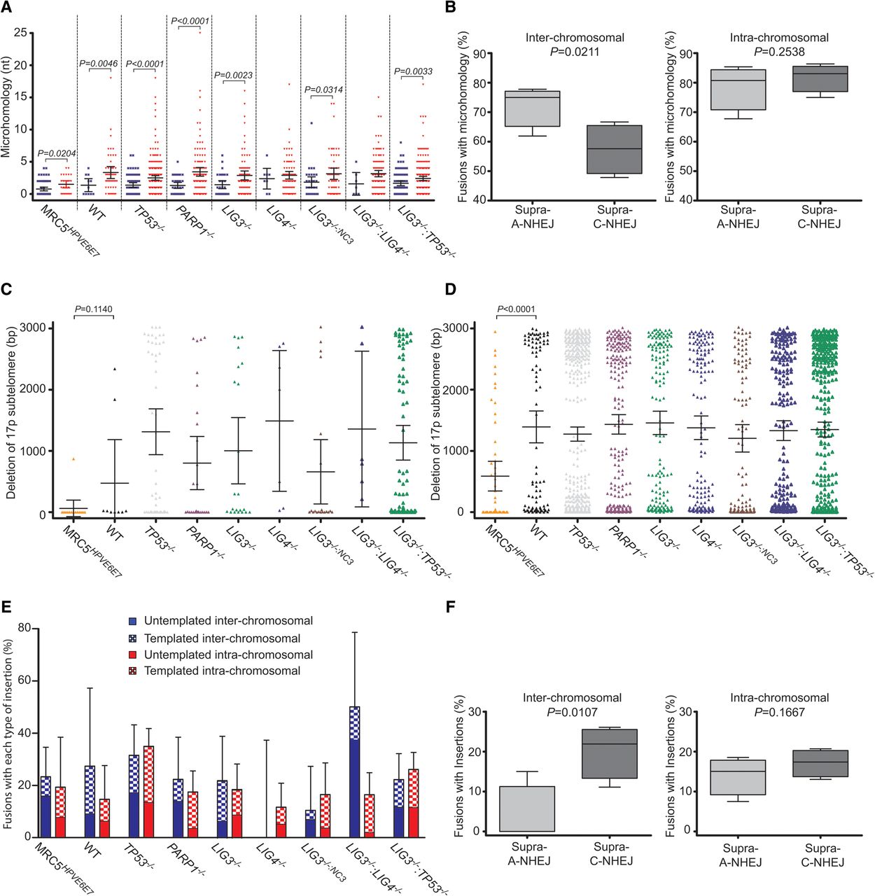 Differential processing of inter- and intra-chromosomal fusion junctions in crisis-stage MRC5HPVE6E7 and 17p TALEN-treated HCT116 cell lines. (A) Microhomology usage (≥1 bp sequence overlap) at each fusion junction plotted as a scatter chart with mean values and 95% CI for each sample. Mean nucleotides of microhomology at inter-chromosomal fusion junctions (blue crosses) are significantly lower (two-tailed unpaired t-test, Welch's correction) for all samples (except LIG4−/− and LIG3−/−:LIG4−/−) than the corresponding intra-chromosomal fusion junctions (red triangles). (B) The approximate 25% increase in percentages of inter-chromosomal (left) but not intra-chromosomal (right) fusion junctions with microhomology identified for Supra-A-NHEJ (LIG4−/− and LIG3−/−:NC3) over Supra-C-NHEJ (PARP1−/− and LIG3−/−) samples is statistically significant (P = 0.0211, one-tailed unpaired t-test with Welch's correction). Resection from the 17p TALEN cleavage site (HCT116) or telomere repeats (MRC5HPVE6E7) for each 17p inter-chromosomal (C) or intra-chromosomal (D) fusion chromatid plotted as a scatter chart with mean base pair and 95% CI, revealing notable length asymmetry of intra-chromosomal fusion partners. The greater than twofold lower mean resection of MRC5HPVE6E7 compared with HCT116 WT chromatids was statistically significant (P < 0.0001) by one-tailed unpaired t-test with Welch's correction. (E) The percentages of inter-chromosomal (blue) and intra-chromosomal (red) fusion junctions containing insertions (<50 bp) plotted with 95% CI including subclassification of events as templated (≥2 nt sequence similarity; checkered boxes) or untemplated (no BLAST nucleotide alignment; solid boxes). (F) The statistical significance (P = 0.0107) of the approximate fivefold increase in mean percentage of inter-chromosomal (left) but not intra-chromosomal (right) junctions with insertions for Supra-A-NHEJ samples was evaluated by one-tailed unpaired t-test with Welch's correction.