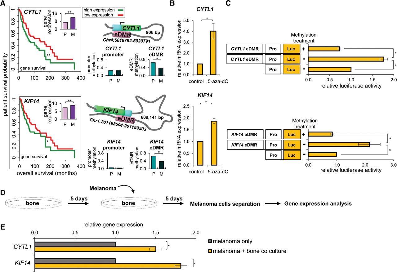 Melanoma coculture with osteoblasts alters pro-cancer eDMR-associated gene expression. (A) Schematic representation of the eDMR-gene pairs: Chr4:5019792–5020791 for CYTL1 and Chr1:201198504–201199503 for KIF14. The eDMR (pink) is interacting with the promoter (cyan) of the gene (green) through chromatin looping. Kaplan–Meier survival plots (left panels) show significant differences between patient outcomes at high and low expression levels (green and red curves, respectively) of CYTL1 and KIF14 genes. (Insets) Bar graphs show up-regulation of CYTL1 and KIF14 in melanoma bone metastases. Middle panels: Methylation of the promoters of these genes does not vary between primary melanoma (P) and melanoma bone metastases (M). Right panels: Enhancers are differentially hypomethylated in melanoma bone metastases (Wilcoxon rank-sum tests, [*] q < 0.15, [**] q < 0.05; FDR adjusted). (B) WM3682 melanoma cells were treated with 10 µm 5-aza-dC or with DMSO (control) followed by quantification of CYTL1 and KIF14 mRNA levels that were normalized to GAPDH. Data are relative to levels in control-treated cells. Error bars represent ± SEM; (*) P < 0.05; N = 3. (C) WM3682 melanoma cells were transfected with methylated CYTL1-eDMR or KIF14-eDMR reporter plasmids, unmethylated eDMR reporter, or reporter without eDMR (control). Firefly luciferase activity is normalized to Renilla luciferase. Fold-changes are relative to control. Error bars represent ± SEM; (*) P < 0.05; N = 3. (D) Experimental design scheme. (E) Levels of CYTL1 and KIF14 mRNA were determined in melanoma cells before and after coculturing with osteoblasts. Data were normalized to levels of actin. Error bars represent ± SEM; (*) P < 0.05; N = 3.