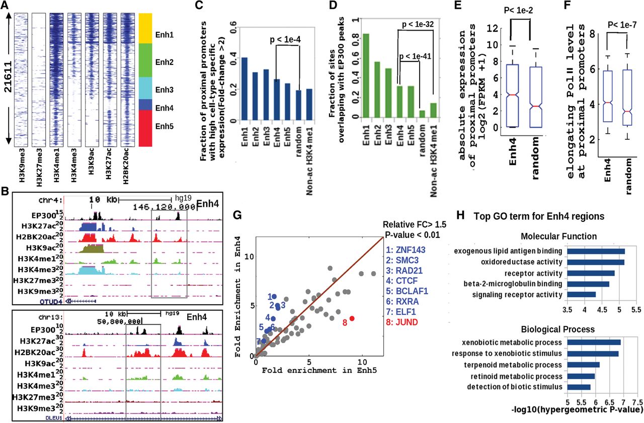 A novel histone acetylation signature at putative distal enhancer regions in GM12878 cells. (A) Clustering of nonpromoter histone-acetylated regions (H2BK20ac or H3K27ac) based on ChIP-seq profiles of seven histone marks. Flanking regions’ width in spatial heatmap is 4 kb, and the number of Enh4 regions is ∼2000. (B) Genome Browser view of two regions from the Enh4 class (black boxes), showing H2BK20ac and EP300 binding in the absence of the two other acetylation marks. (C) Cell-type-specific expression of promoters proximal (closest within 100 kb) to enhancer regions of different classes compared to randomly chosen regions and also regions marked by H3K4me1 but not by histone acetylation (non-ac H3K4me1). (D) EP300 occupancy of the same sets of regions. (E) Absolute expression (FPKM) of promoters proximal to Enh4 regions relative to random regions. (F) Elongating (S2-phosphorylated) Pol II ChIP-seq signal at proximal promoters of the same regions. (G) Fold excess above genomic background of TF binding sites (ChIP-seq peaks) in Enh4 and Enh5 regions. (Blue dots) TFs enriched more in Enh4 than in Enh5 (P-value <0.01, FC > 1.5). (Red dots) TFs enriched more in Enh5 than in Enh4. (H) Top five enriched functional categories of genes proximal to Enh4 regions (GREAT gene ontology tool).