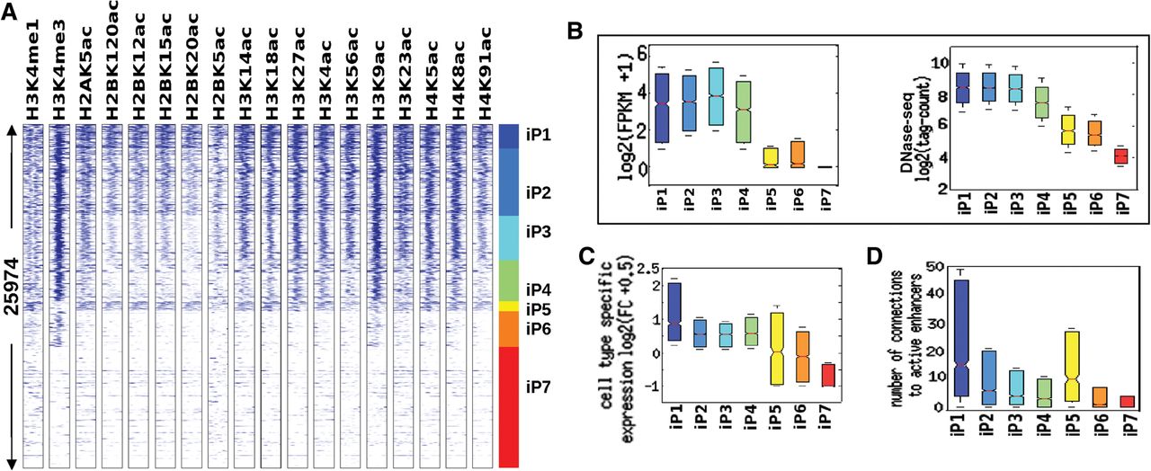 Regulatory properties of active promoters in IMR90 cells using 18 histone acetylation profiles and Hi-C data. (A) Clustering of RefSeq promoters by IMR90 histone modification profiles: iP1-iP7 classes identified de novo from this data set match P1–P7 classes in Figure 4. (B) Absolute expression and DNase hypersensitivity for each of the seven IMR90 promoter classes. (C) Cell-type-specific expression. (D) Number of enhancer–promoter connections (Hi-C) for each of the seven IMR90 promoter classes.