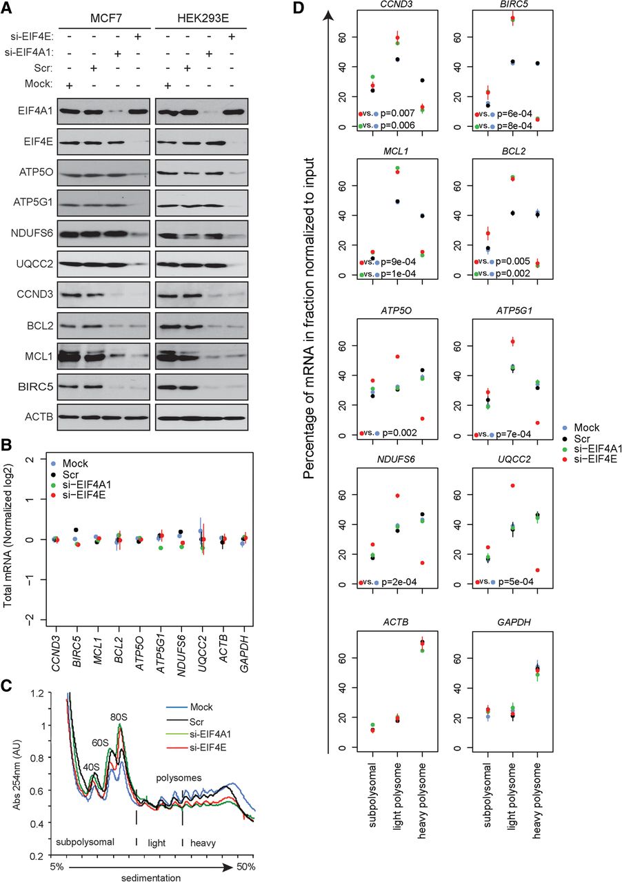 Expression of proteins encoded by mRNAs with long 5′ UTRs, but not those harboring short 5′ UTRs/TISU elements, is dependent on EIF4A1. (A) HEK293E and MCF7 cells were mock-transfected or transfected with siRNA targeting EIF4A1 (si-EIF4A1), EIF4E (si-EIF4E), or scrambled control siRNA (Scr). Levels of indicated proteins were determined 48 h post-transfection by Western blotting. ACTB served as a loading control. Experiments were carried out in independent triplicate and quantified using densitometry (Supplemental Fig. 9). (B) Total levels of indicated mRNAs isolated from cells described in A were determined by RT-qPCR. Data were log2 transformed, and values obtained for indicated mRNAs were normalized to those obtained for ACTB and to the mean expression per gene. (C) Subpolysomal, light polysome, and heavy polysome fractions were obtained from cytosolic extracts from cells described in A by ultracentrifugation using 5%–50% sucrose gradients. During fractionation, UV absorbance at 254 nm (Abs 254 nm) was continuously monitored to obtain absorbance tracings. Positions of 40S and 60S ribosomal subunits, monosome (80S), and polysomes are indicated. (D) Amount of indicated mRNAs in subpolysomal, light polysome, and heavy polysome fractions isolated from cells described in C were determined by RT-qPCR. Experiments in panels B and D were carried out in independent duplicates, each consisting of a triplicate. Data are expressed as a percentage of a given mRNA in each fraction. Bars represent SD values. P-values from one-way ANOVAs for heavy polysomes are indicated.