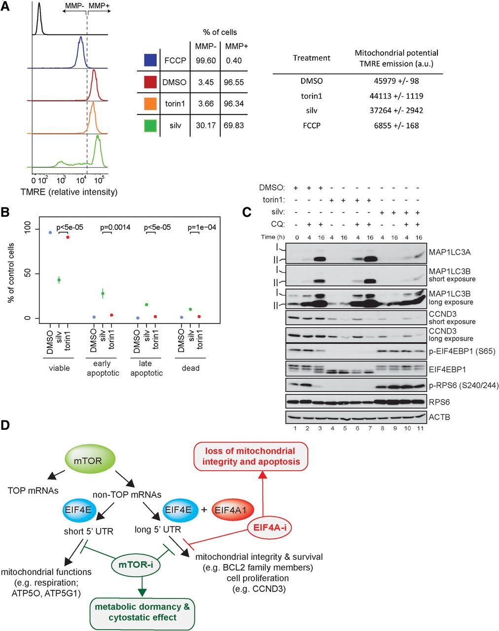 Prolonged (72 h) inhibition of EIF4A1, but not MTOR, compromises mitochondrial integrity and leads to apoptosis. (A) HEK293E cells were treated with torin1 (250 nM), silvestrol (silv; 25 nM), or a vehicle (DMSO) for 72 h. Mitochondrial membrane potential (MMP) was analyzed by monitoring TMRE fluorescence intensity by flow cytometry. As a control, cells were treated with FCCP (20 μM; 10 min) to induce mitochondrial membrane depolarization. (Left panel) The flow cytometry histogram profiles of unstained (control; black) and TMRE stained cells treated with FCCP (blue), a vehicle (DMSO; red), torin1 (orange), or silvestrol (silv; green). Cells harboring depolarized mitochondria (MMP−) were defined as those with a TMRE signal equal to or less than the TMRE signal observed in FCCP-treated cells. (Middle panel) Mean percentage (n = 3) of MMP− and MMP+ cells out of total viable cells (DAPI positive dead cells were excluded). (Right panel) Overall TMRE emission expressed in arbitrary units (a.u.). Results are presented as mean ± SD (n = 3). (B) HEK293E cells were treated as described in A, and apoptosis was measured by flow cytometry using a FITC-Annexin V/PI staining. The fractions (%) of viable (Annexin V−/PI−), early apoptotic (Annexin V+/PI−), late apoptotic (Annexin V+/PI low), and dead (Annexin V+/PI high) cells are shown relative to the total cell population. Results represent means ± SD (n = 3). P-values from one-way ANOVAs are shown. (C) HEK293E cells were treated with torin1 (250 nM) or silvestrol (silv; 25 nM) in the presence or absence of chloroquine (CQ, 50 µM) for 4 and 16 h. Autophagy induction was monitored by the detection of MAP1LC3A/B lipidation (MAP1LC3A-II and MAP1LC3B-II) using appropriate antibodies. The levels and phosphorylation status of indicated proteins were monitored by Western blotting. ACTB served as a loading control. (D) Schematic representation of the model. In addition to 5′ TOP motif (TOP mRNAs), 5′ UTR features define two distinct subsets of non-TOP mRNAs whose translation is stimulated by MTOR (mTOR; green): (1) mRNAs with long 5′ UTRs whose translation is sensitive to both EIF4E (blue) and EIF4A1 (red), which encode pro-survival- (e.g., BCL2) and proliferation-promoting (e.g., CCND3) proteins, and (2) mRNAs with short 5′ UTRs whose translation is sensitive to EIF4E (blue), but not EIF4A1 (red), which encode proteins with mitochondrial functions (e.g., ATP5O). Whereas MTOR-i (mTOR-i; green) suppresses translation of both subsets of mRNAs (1 and 2) leading to metabolic dormancy and cytostatic effect, EIF4A-i (red) selectively inhibits translation of mRNAs with long 5′ UTRs (1), leading to apoptosis.